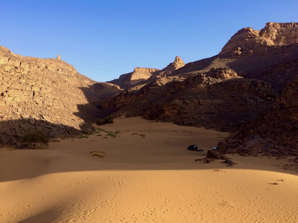 The rest of the day is more pit stops for rock paintings and carvings until I see on my offline map that we exit Tadrart, as our jeeps pull into a shadowy patch right by the highway. What’s this? Rafik asks the driver. We’re returning to Djanet tomorrow, Kader says. What? Our tour is supposed to last for 6 days! Rafik insists. What ensues in the long evening is some sort of Algerian-French mini-drama, about who’s right, who’s wrong, how many days should our tour be, what we will be doing in the two remaining days, whether we should just return to the Djanet camp – within an hour’s drive – NOW, for a hot shower and warm bed, ask for a partial refund, rebook the return flight to Algiers… The guide and drivers take off to get signal to call the agency while the chef serves us coffee and cookies at seven p.m. to calm our nerves in vain. All of a sudden, the accumulated discontents of the past days all pour out: the loud music, not-so-nice young drivers and their unsafe driving, the same salad-and-soup, and a depressing guide. TIA: This is Algeria. I have paid for two tours totalling twelve days, supposedly first five in Tadrart, followed by seven in Sefar. But nothing is according to the programs! Take it or leave it! Finally the jeep returns. Oh, it’s just a miscommunication between the owner and the driver, so we’re told. All is well, or so it seems. It’s past nine, and Chef Merut makes us a delicious soup and Ahmed prepares soaked pasta Touareg style. The plan is to stay in the desert tomorrow (not a difficult thing to do here!). Ten p.m. nights out. Ahmed’s bag is way too close to my tent, making me very nervous. I ask Rafik and Meriem, s’il vous plaît, make sure he is not sleeping next to me!