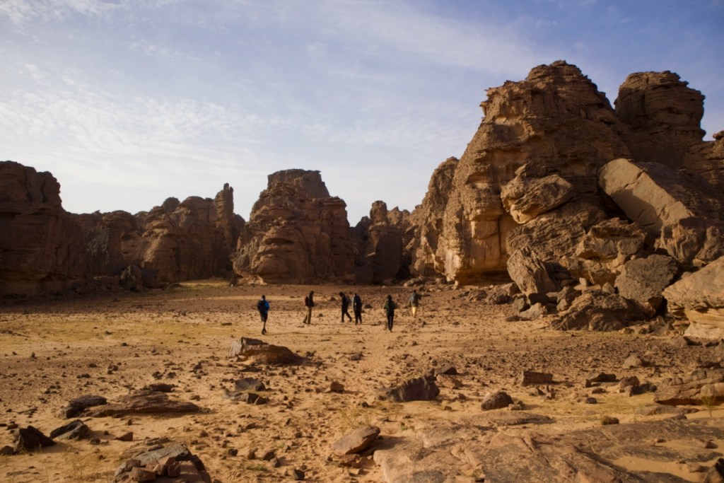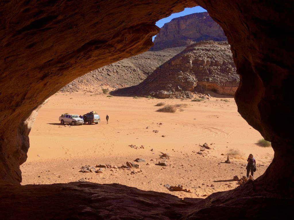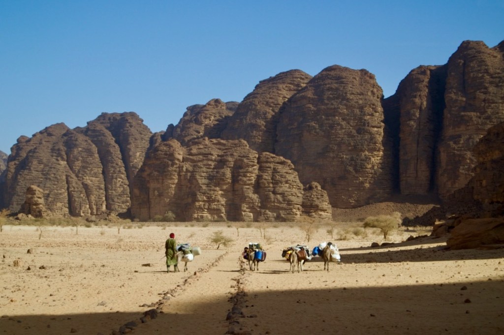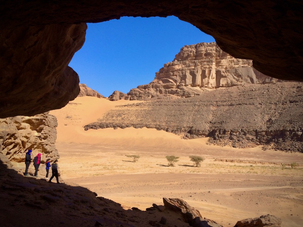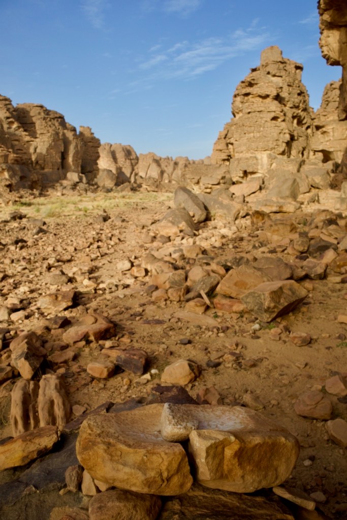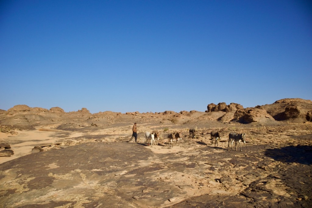Six a.m. wake-up call by Wafik, followed by morning yoga and breakfast, and departure after eight. Aingafa, Ain Aliwane – where once oliviers bloomed – the Tamrit tomb, and a pause at Ain itinane with gorgeous rock columns. We cross the Etagas Ilyas plateau and take a break in the sprawling plain of Asrire to wait for our donkeys. Mahmood never found his but manages to retrieve two that he had loaned to another group. Onward we go to Tin Tefaltase and Ain Tohami, and reach Sefar shortly after noon.