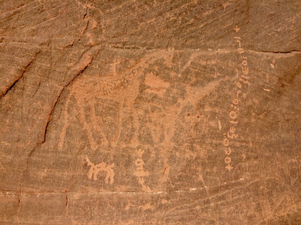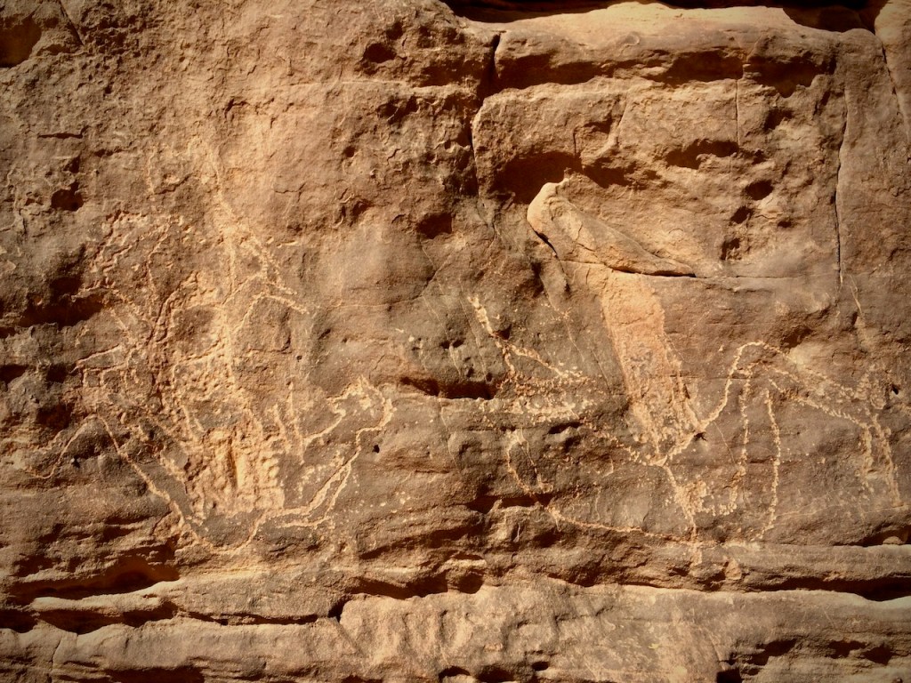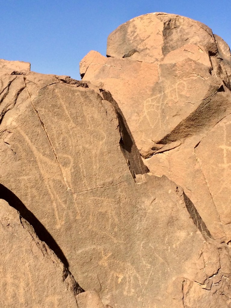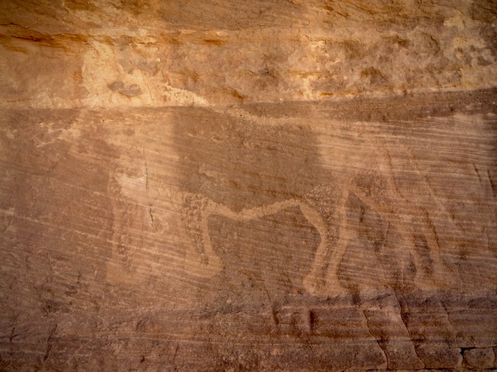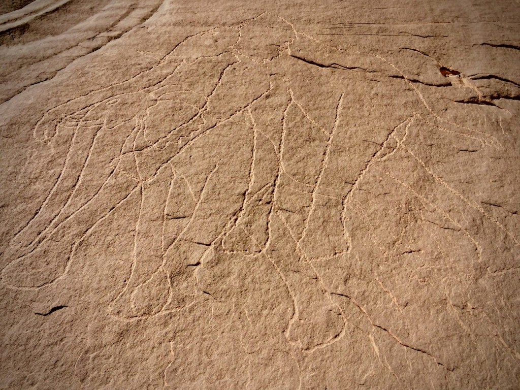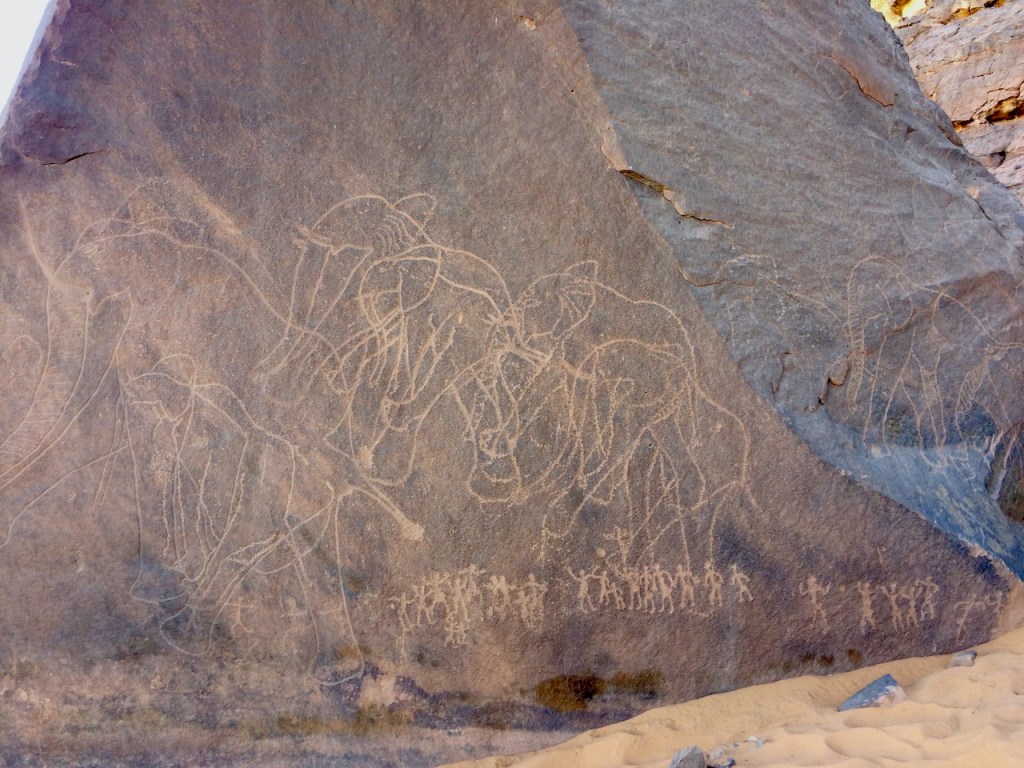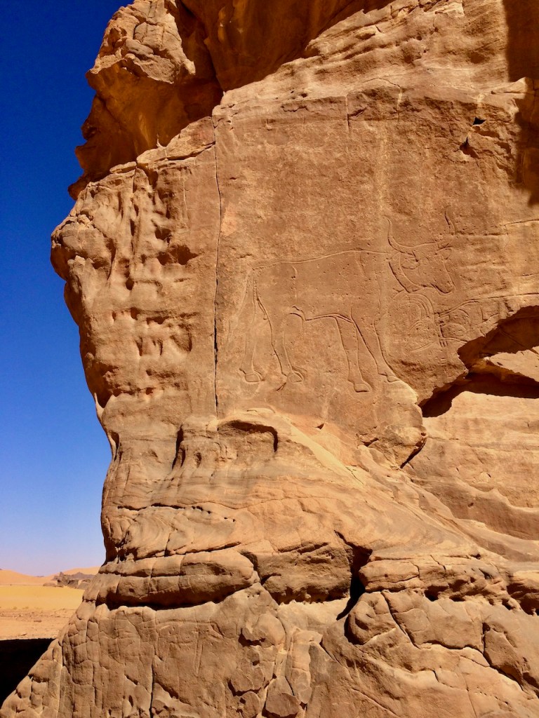Ten a.m. start for the Algerian French family who is here in the desert to relax – what a change from the trek! In the morning walk, Ahmed shows us desert “melons”/citrullus colocynthis (inedible!), kalatropis trees (toxic!), and fresh camel foot prints (as well as carcasse!). We see giraffe paintings and carvings of elephants, turtles, and scorpions. After lunch, we drive through impressive dunes and stop at a lion carving with vivid scratch marks and animal footprints. Arriving at camp at four, we fool around the dunes baking in the Saharan sun as a quasi-full moon rises…