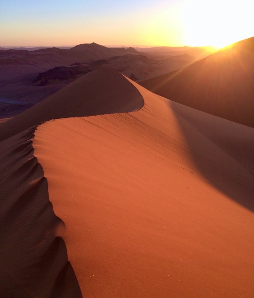 Among the first to arrive at camp, we excitedly head to the giant dunes. The family decides to take the left deceptively easier variant while I tackle the crest, arriving at the top at four thirty p.m. What a view, with the immense plain, resembling Dante’s inferno, stretching to the horizon. The setting sun is ahead, the rising moon in my back, and golden sand all enveloping. All of a sudden, I hear Yunus’ tunes before he dashes towards us! The sun dips lower by the minute as a small crowd gathers for an eternal sunset. The colours begin to fade, and then a full moon graces us with her majestic presence lighting up the whole place. What emotions!
