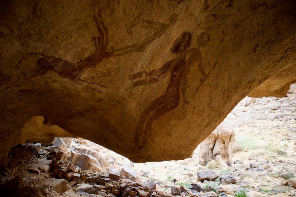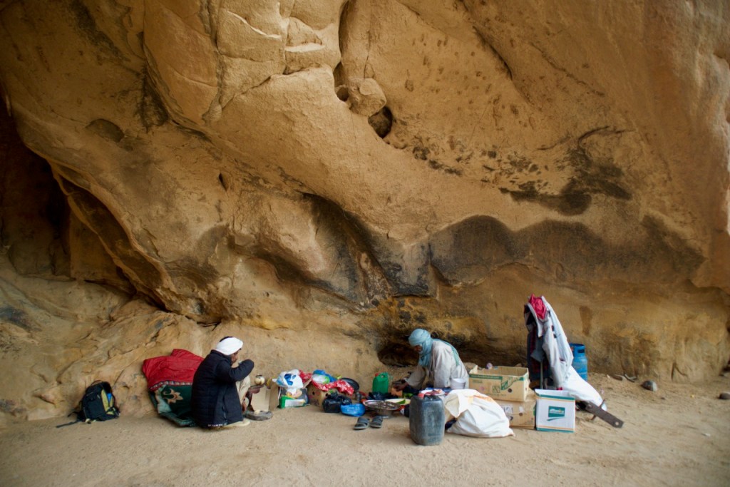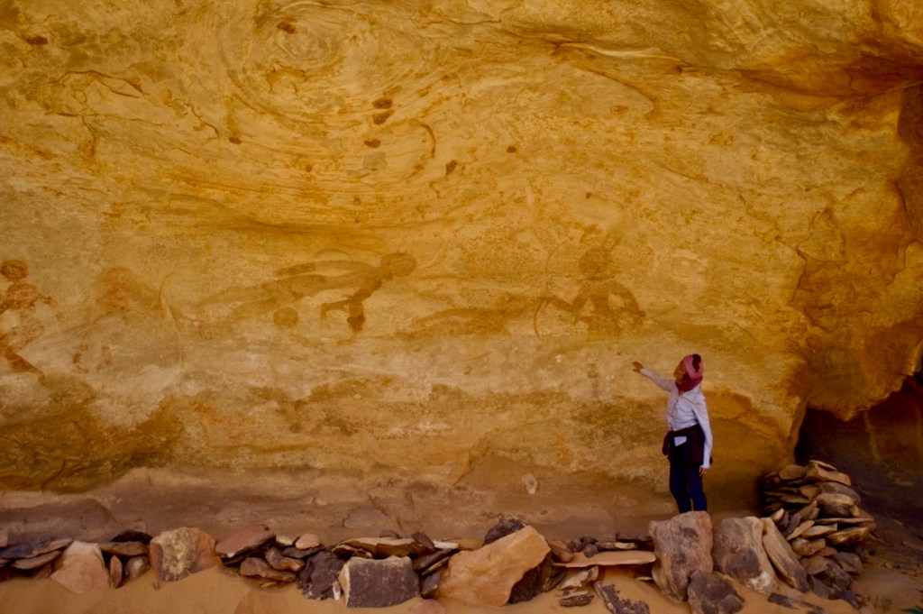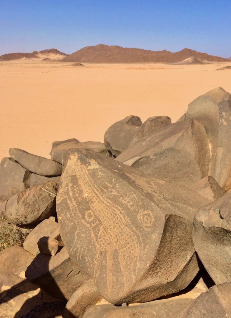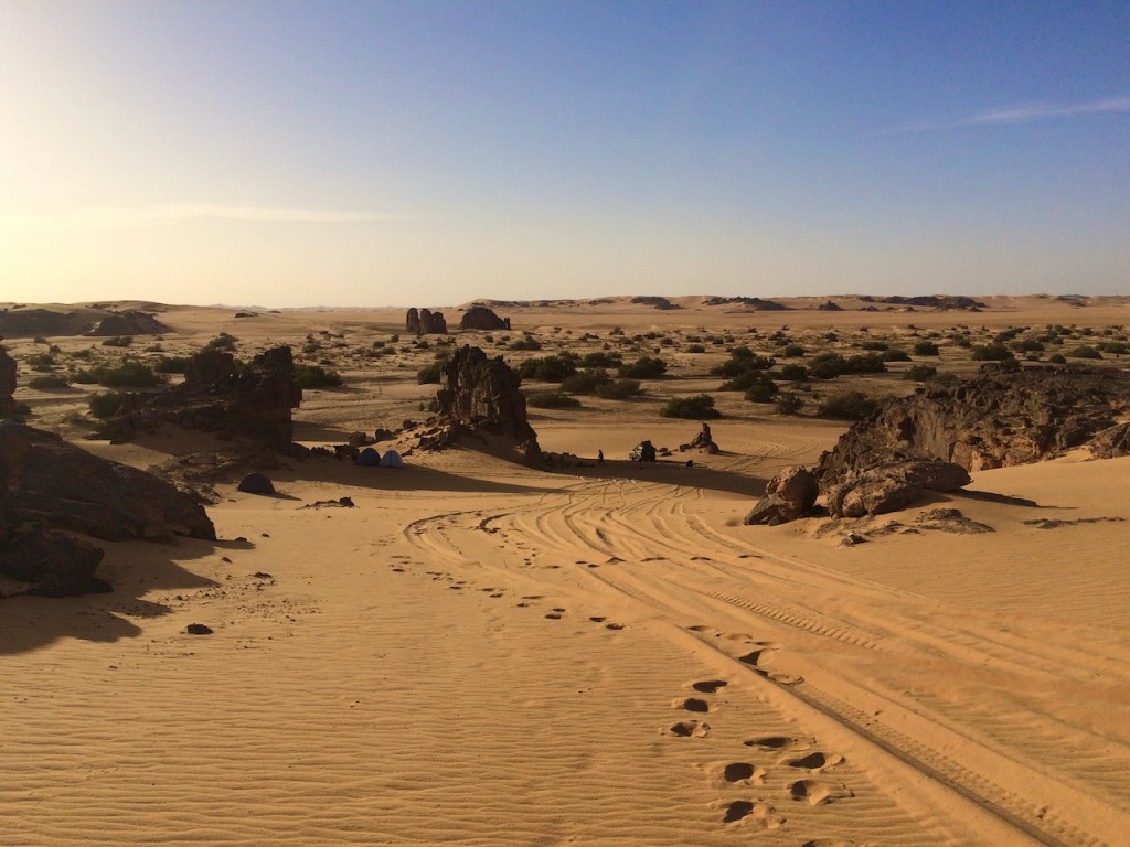 We begin Day 4 with a morning tour in Western Sefar to admire yet another mindblowing collection of prehistoric rock drawings of birds and pigs, music and dance, horses and swimmers! What a landscape with such a mesmerizing variety of rock formations. Finally, the sun is out and the solar panel is working! I take a two-hour-long nap – recharging my battery – after a big serving of fries and veggie stew at lunch. Reluctantly, we leave Sefar and return to Ain Itinane, crossing a plain that resembles Dante’s Inferno. If not for the clouds, we could almost see Libya, Ali says. The end is already near…