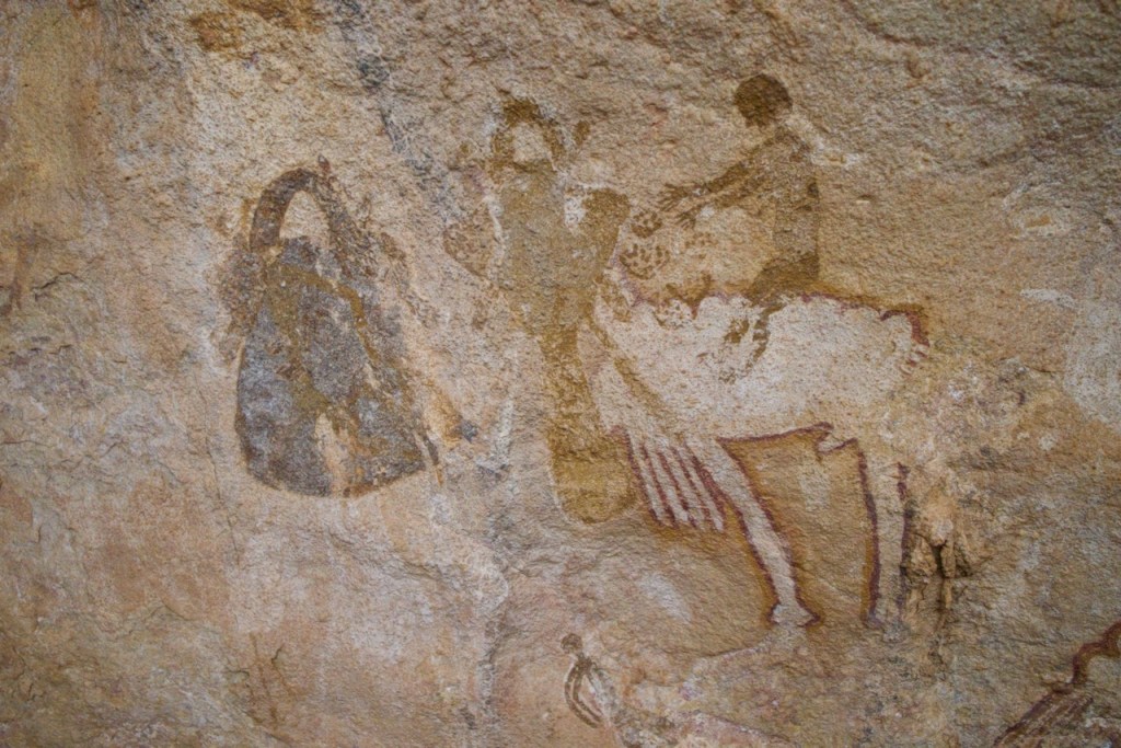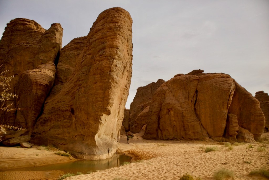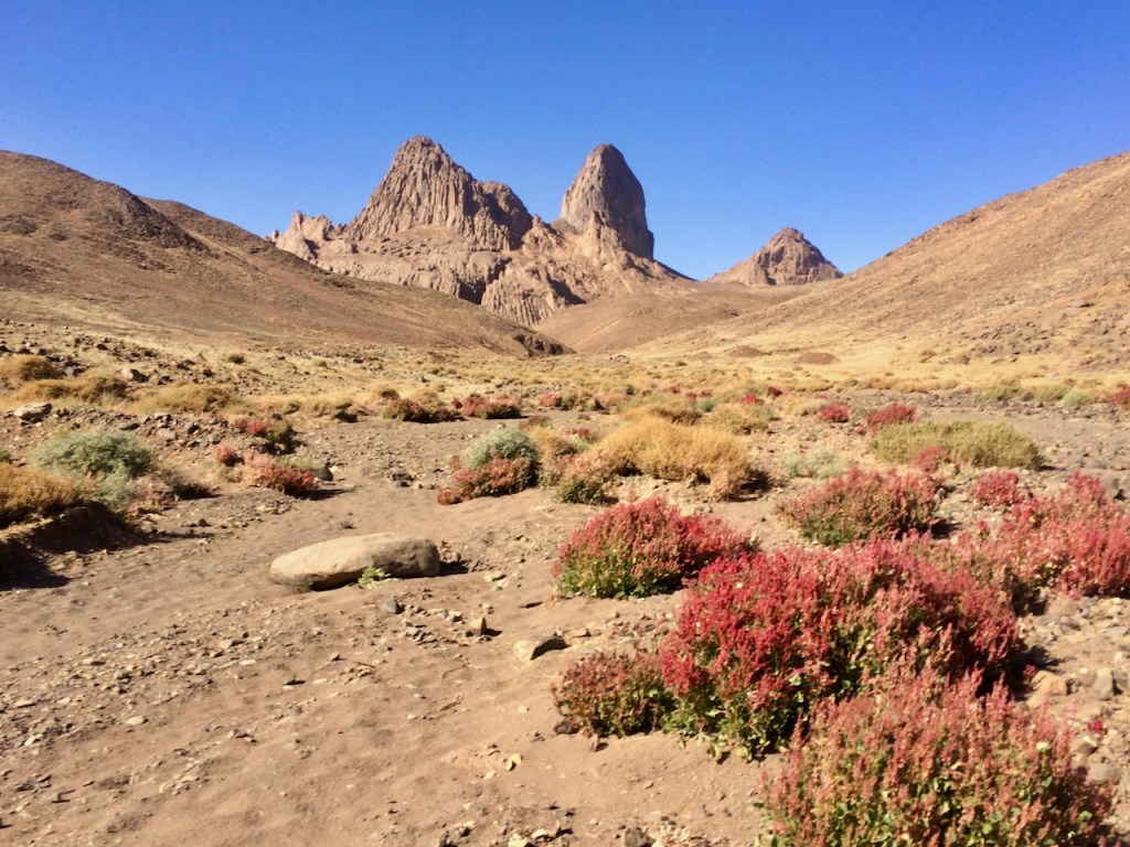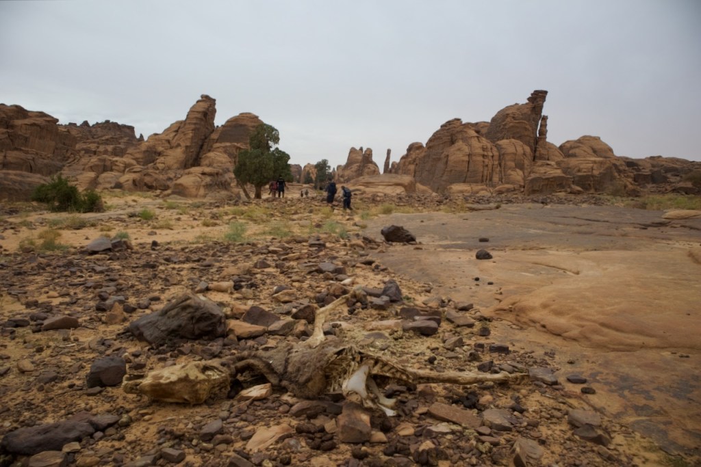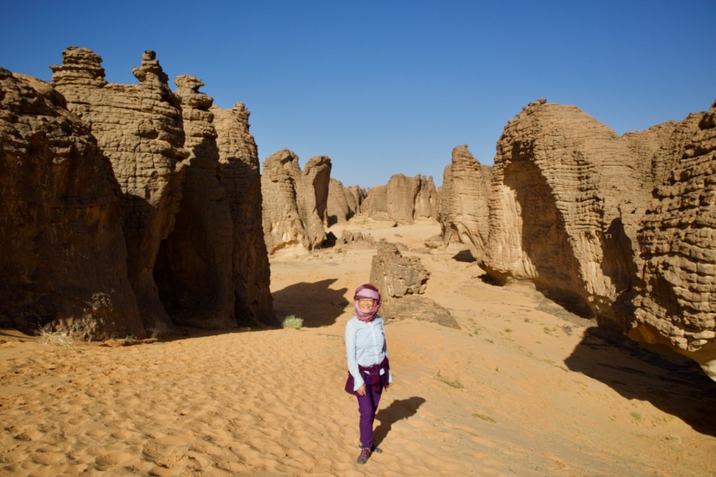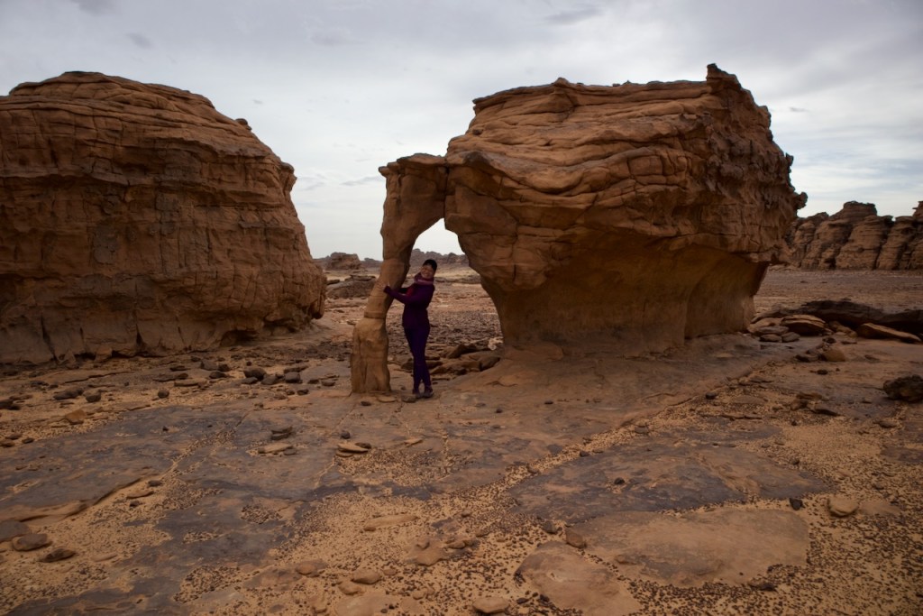 What an enchanting place with desert flowers and scrubs, 2500-year-old trees, rock cathedrals, and a rich collection of rock paintings of women, children with hoopla, cows, goats, snakes. Today, my “worry” is my camera battery that’s draining fast in this spectacular landscape. Somehow I erroneously assumed that there would be a “charging station” provided by the guides at the end of each day, as in safaris in other countries. Ali has a solar panel, but it has been cloudy, and before long, it starts even to rain, in the Sahara! I feel so blessed to be here, never mind the photos, just go with the flow!