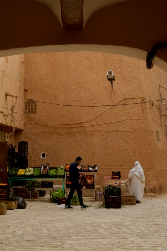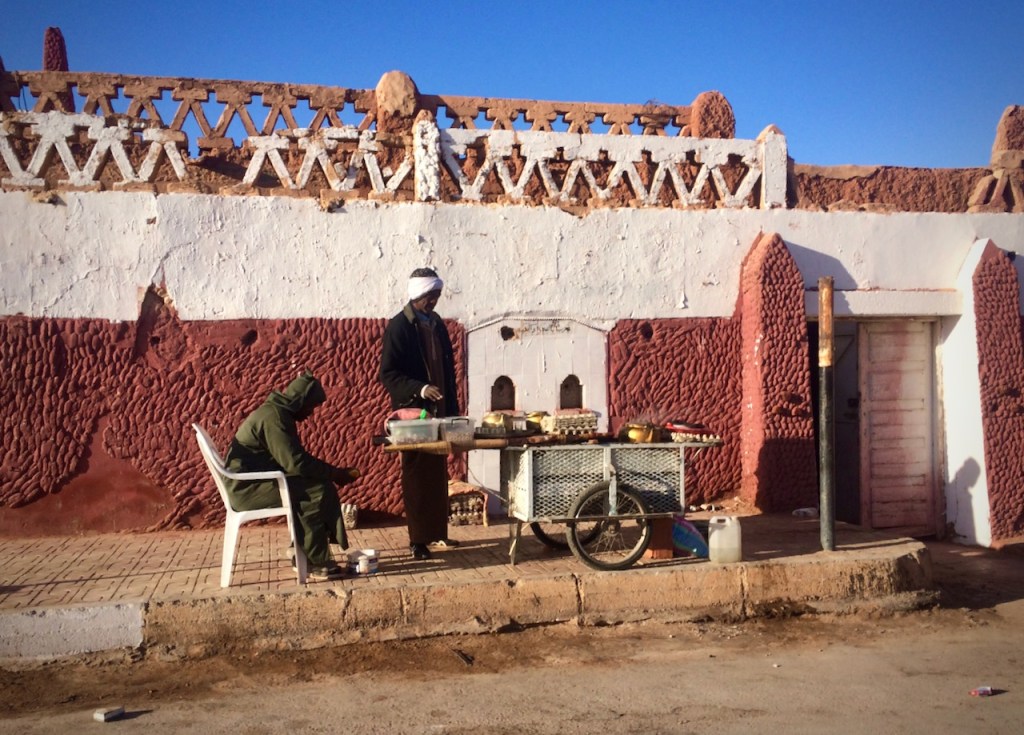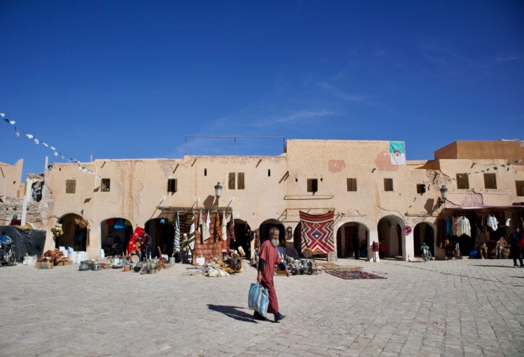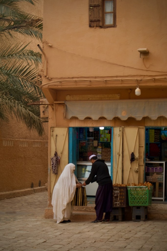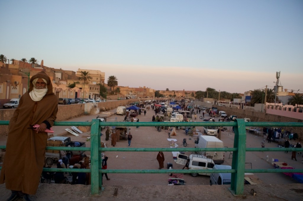 The first iconic view of Beni Isguen, the most enigmatic village with pastel coloured homes and an old mosque perched on top known for her conservative traditions, is unforgettable. Haji, an old guide, takes me through the web of alleyways in an hour-long tour, blurting out years and dates faster than I can note. El Atteuf was built first, then Bounoura in 1046, Ghardaia in 1053, Beni Isguen in 1321, and Melika in 1555! Fully covered married women – with only one eye exposed – come and go, disappearing quickly in the labyrinth. At dusk, men gather at the central square where an animated auction unfolds. How much is the jacket? one asks. 20,000 dinars (0.75 euros), the owner replies. There is some commotion around an old scale and I volunteer to step on it. 43kgs, it’s not working, I say, and the crowd breaks out in a laugh.