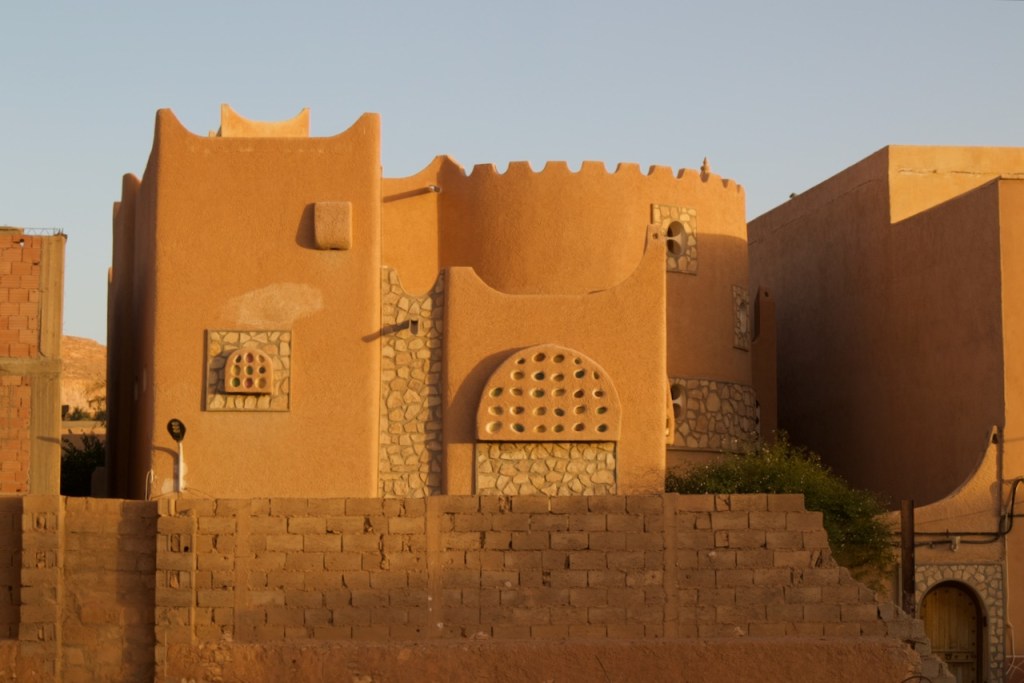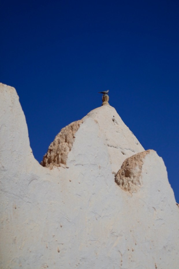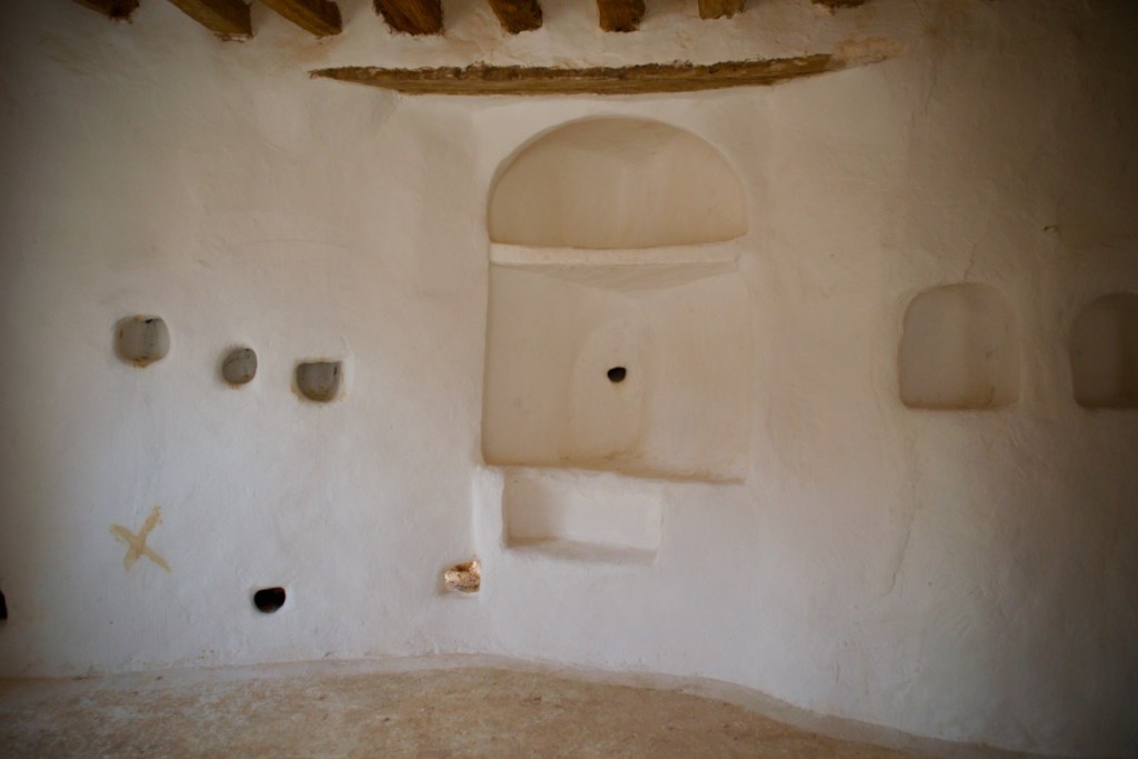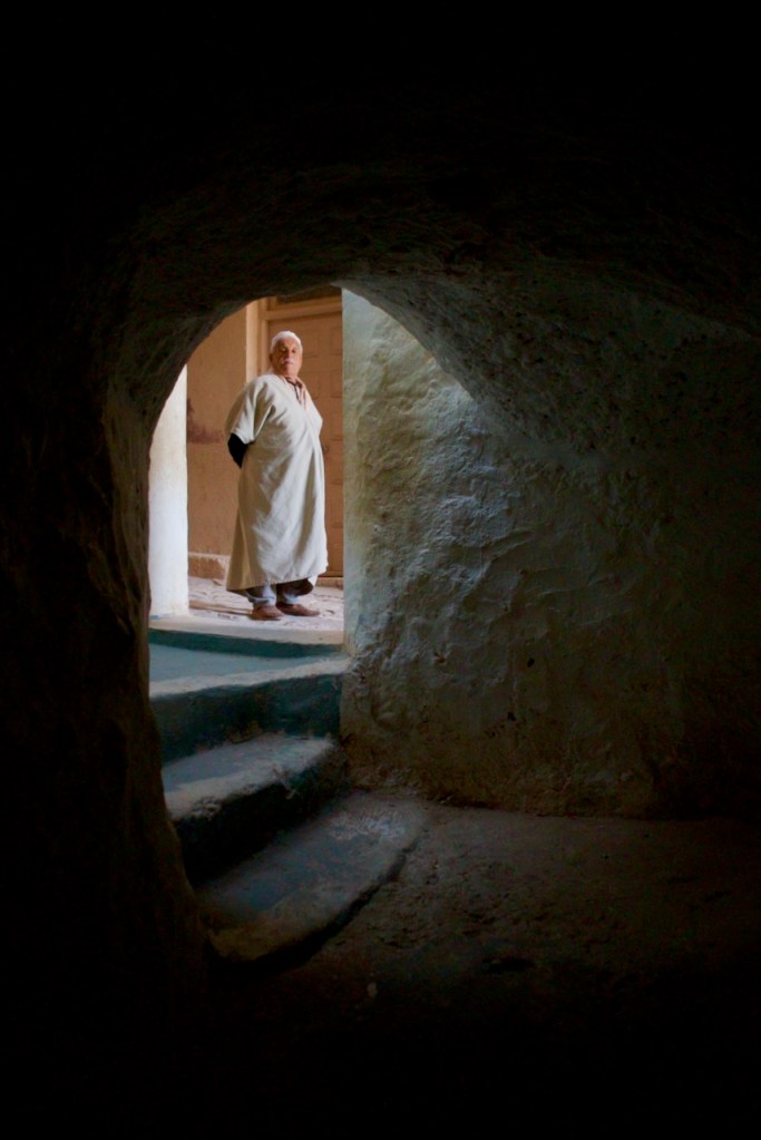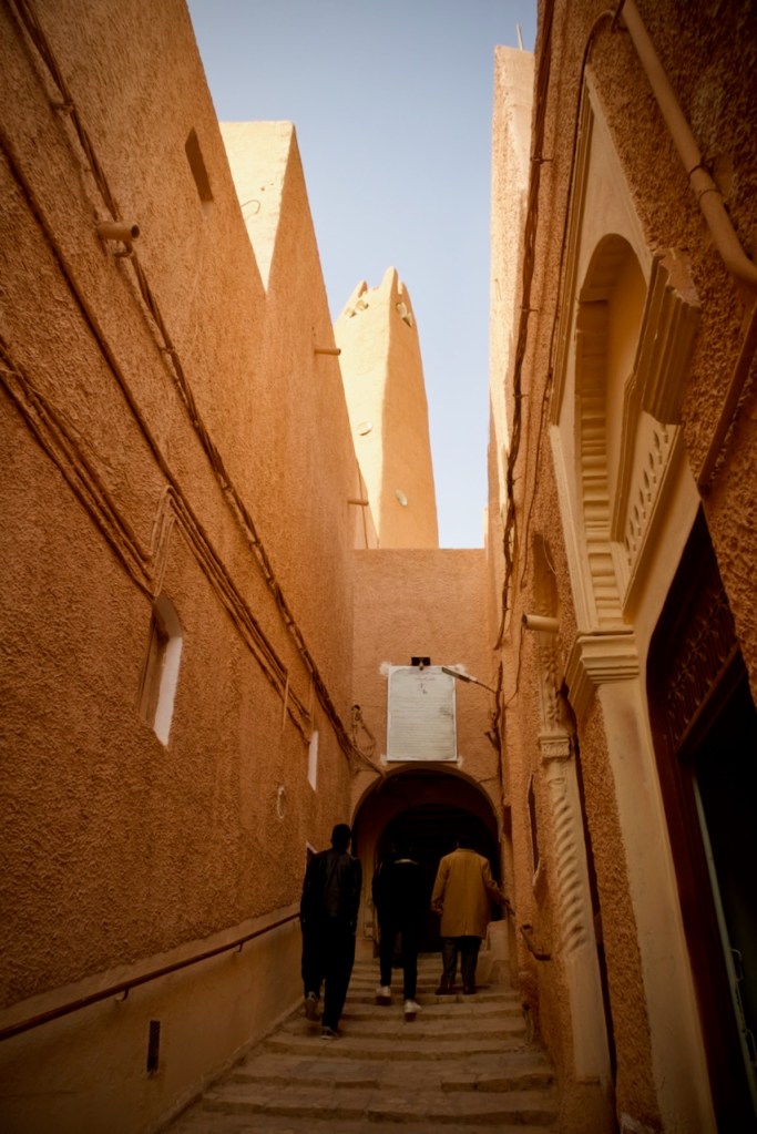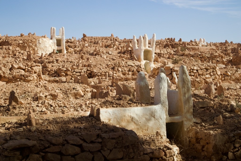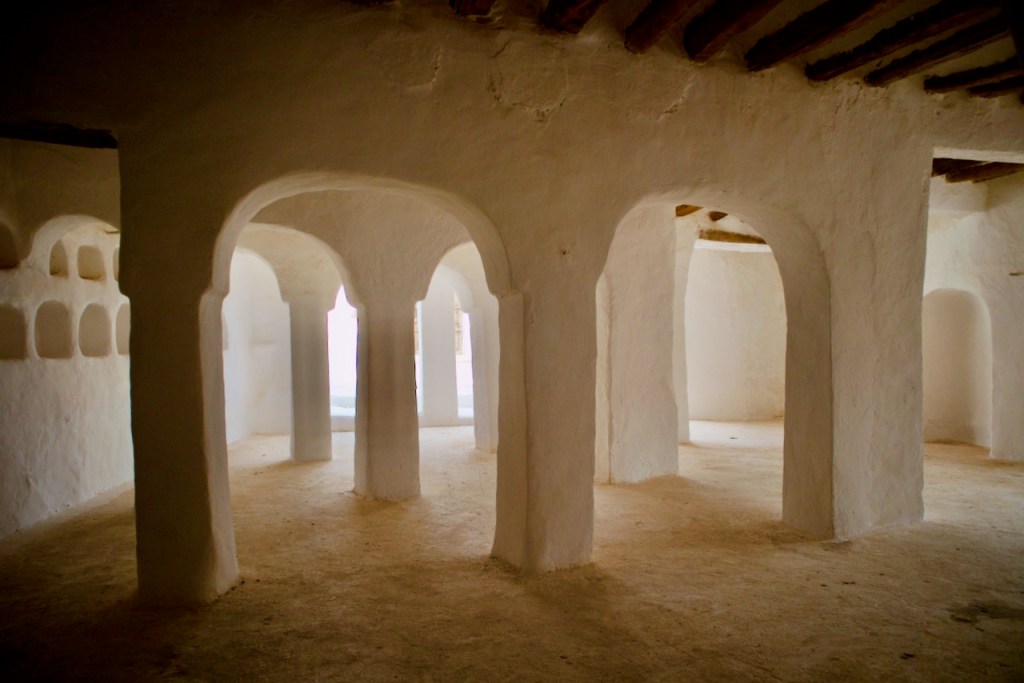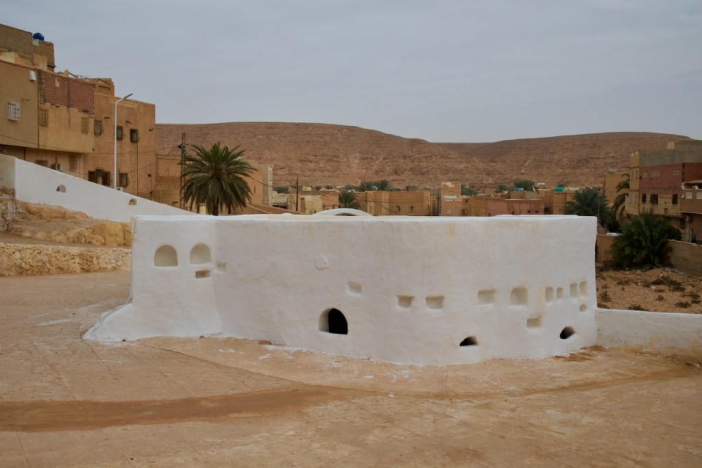 While guided visits are mandatory for Beni Isguen and El Atteuf, one can roam more or less freely in other villages. I take a morning stroll to Melika and then make my way to Bounoura with her stunning old mosque. I keep El Atteuf at the end with the famous Sidi Brahmin mausoleum that has inspired generations of architects from around the world. Built from local materials with stone and lime mortar for walls and pillars, palm trunks for beams, and embedded palm branches for arches, giving each one a different shape, the half underground circular chamber was used for teaching the Koran while an upper room was reserved for the sheikh. The eerily beautiful monument, set in one of the oldest cemeteries, exudes simplicity and transcendence.