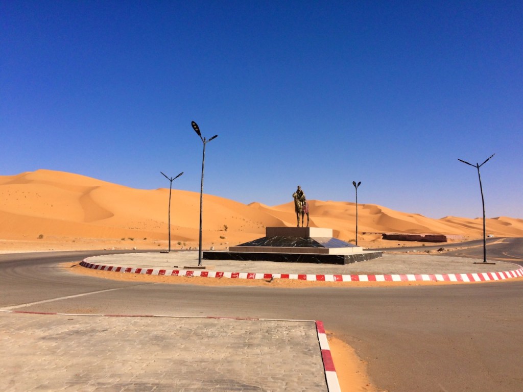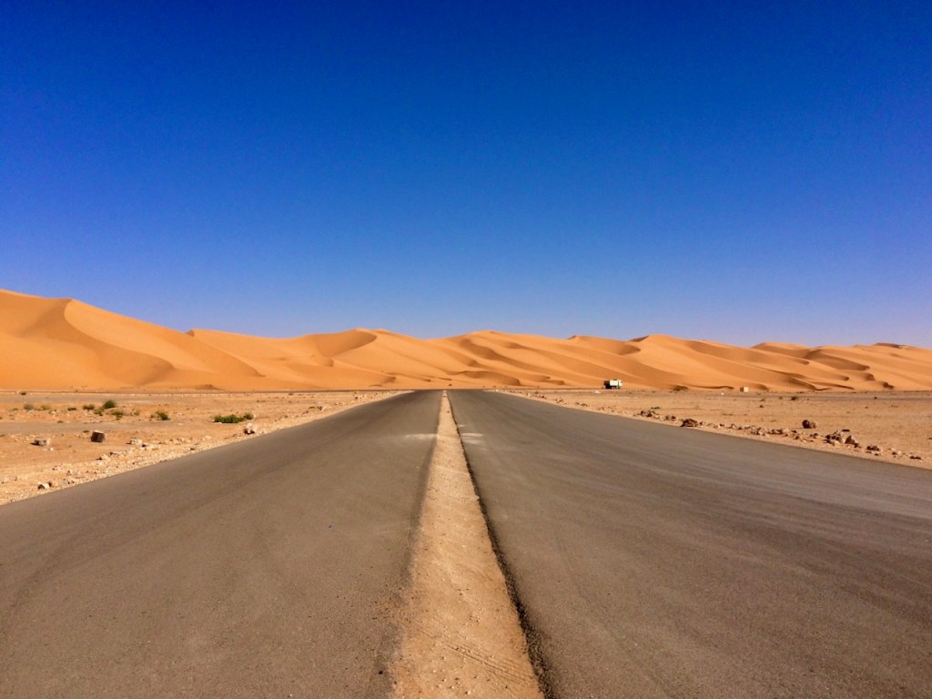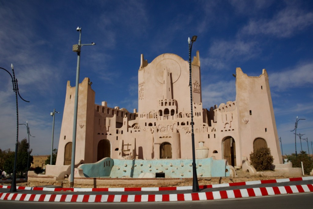There’s only one daily bus departure to Beni Abbes, I was told, at five or six or seven in the morning no one knows. I stand in the dark along the main road not being sure whether the bus has already left until it pulls in by the mosque at twenty minutes past seven. Known as the Pearl of the Saoura with a scorpion-shaped palm grove and dunes so huge that one could apparently ski down, Beni Abbes is a desert haven. You could walk – or drive – for miles to fill your heart’s content!