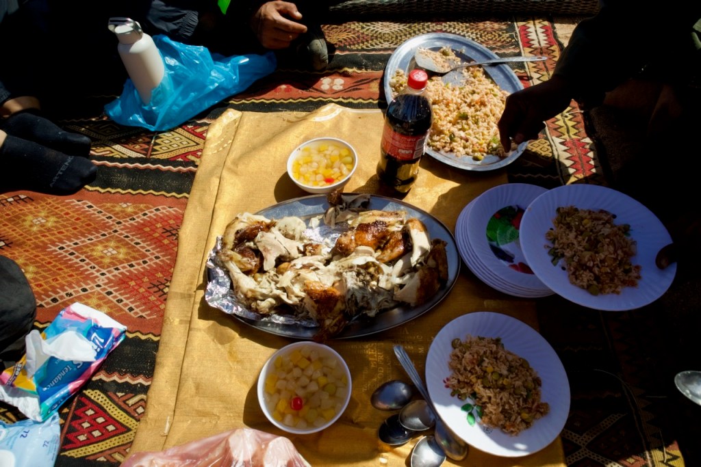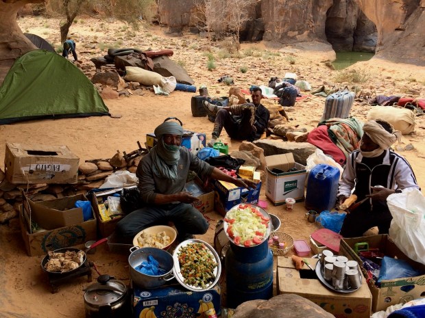 Together with Ali and Mohammed, our guides, Laeid, the chef, Yunus, the musician (included in most tours!), and Mahmood and Moussa, donkey herders, I am accompanied by a group of four Tunisians, led by energetic Wafik. We huff and puff up a rocky path before breaking for lunch. The donkeys – and us – struggle in a particularly steep patch afterwards before crossing an interminable plateau to reach camp in Tamrift. Solan, solan/Slowly, slowly, Ali says.