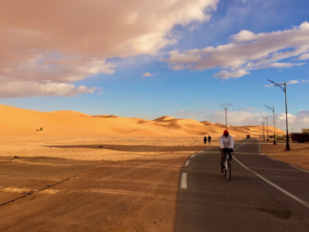 To wake up or not – for a sunrise in the Merzouga – that’s the question! At six a.m, Ahmed knocks at my tent and shows me the way to a dune to the left with a perfect opening for viewing. The wind is blowing and I haul myself up the slippery slope, arriving just in time for the first beams at seven. What joy and happiness with the silence and solitude that only the Sahara knows. A full week here by now, everything from the dry wind to the red dunes, the immense sky and the dancing stars, the exotic music and the addictive tea, is intoxicating. Alas, I have to descend to camp for petit-dej.