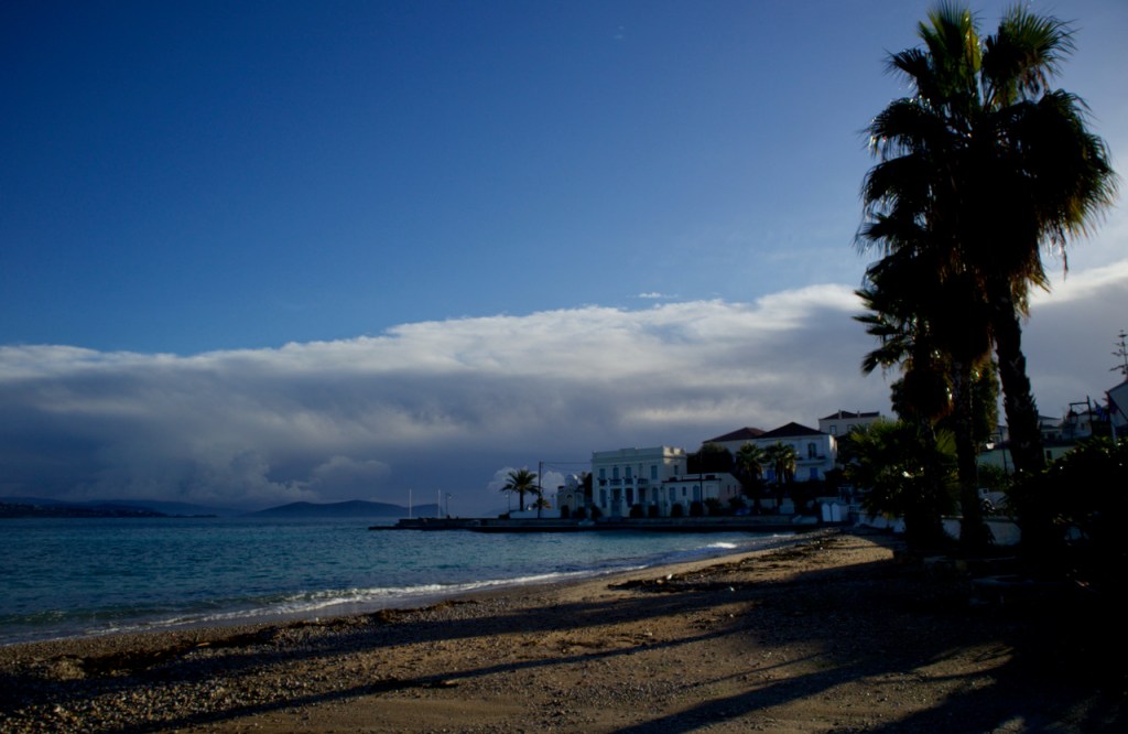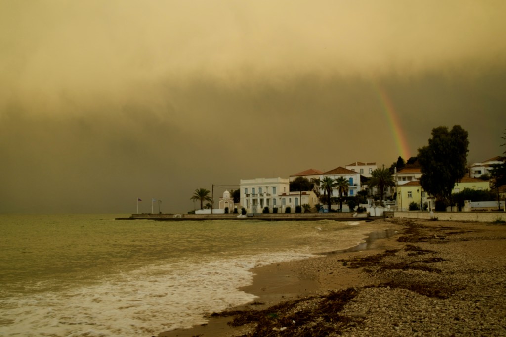 The storm that has been brewing since Delphi gathers full force in Nafplio. I begin my birthday morning with dramatic lightning and reach Porto Heli – via three buses! – only to be told the ferry never left Piraeus. I take a peek around through my steamed up glasses and see nothing. This would be a very minimalist birthday celebration, I console myself, standing there in the desolate pier till a fast boat materializes out of the surging sea. Lucky me! A few stranded locals had called for a private transfer. Birthday on Spetses, as planned. I am even greeted by a welcome sunset rainbow. What a big fat Greek present!