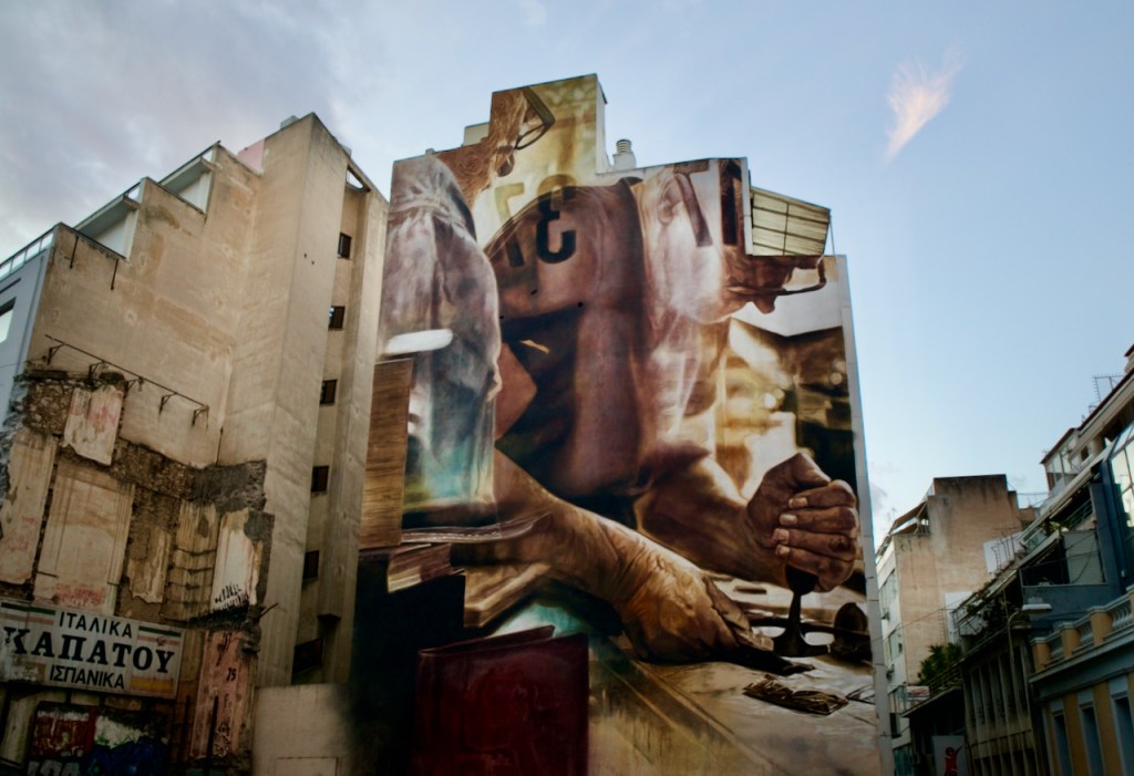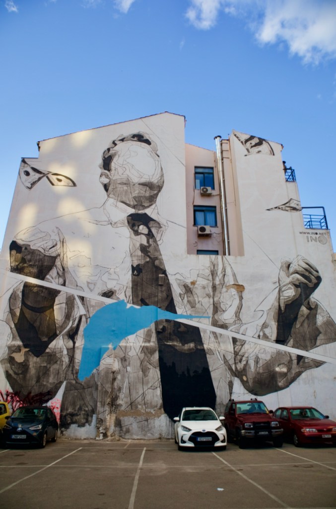 Athens is the new Berlin! For the rest of the week, I take my time to stroll through neighbourhoods old and new to survey the exciting street art scene. Some of the best murals can be found in the gentrified district of Psiri while Exarchia with its street politics has become ground zero of tagging and more. The 2008 financial crisis, debt emergency, and subsequent austerity measures put many Greeks out of their homes. At the same time, Greece has become a popular destination for migrants via the Balkan Route, with upwards of a million entering Greece between 2015 and 2016. Exarchia became a centre of refugee squats and activism, turbocharging a graffiti scene filled with political slogans and symbolism. The Greeks, of course, have always been known for their unique sense of black humour (watch classic films like The Idlers of the Fertile Valley, Dogtooth, and the Small Fish). Little wonder ongoing the political and economic situation makes Athens a hotbed for art activism.