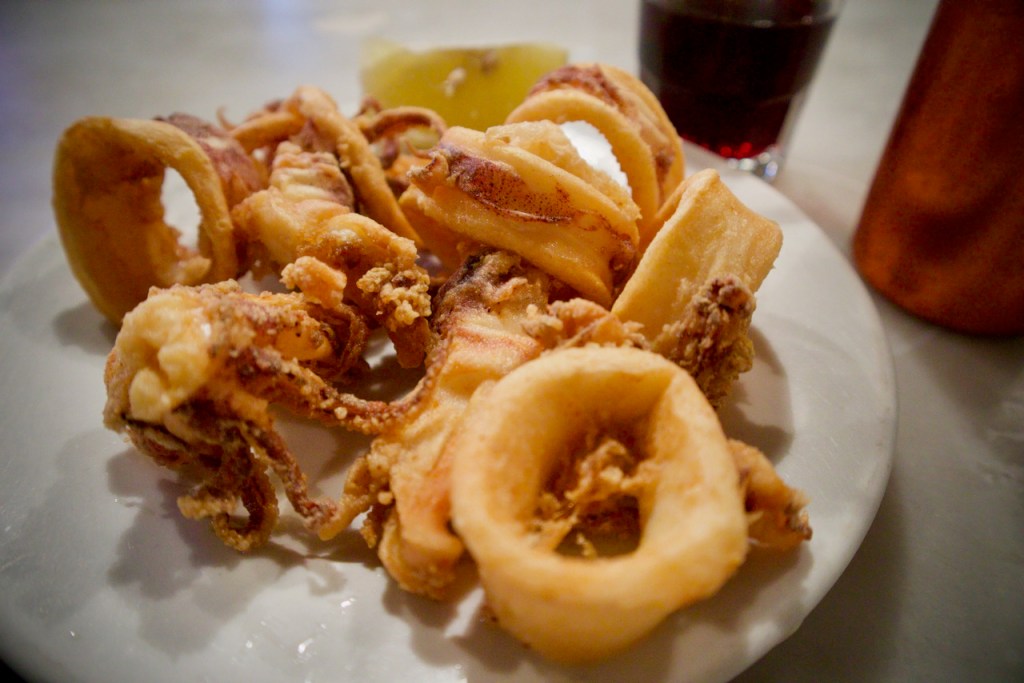 Nychthemeron, by the waterfront, is open! Owner-chef Nektarios (what a name for a chef, of nectar!) greet me with a house red and begins his story. I was in Calgary way back, he says in surprisingly fluent English, and almost stayed in your city. A little meze? he asks. Fried calamari, I reply. Ah, a white would go much better with that! I was going to marry a rich old Greek lady, Maria, in Vancouver, but my mother called me back. My destiny is here in Spetses! What a character, this chef, straight out of a Greek drama!