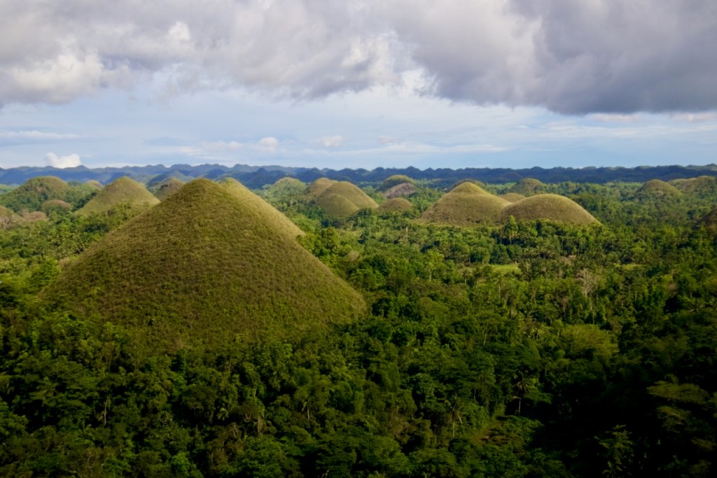 The most famous tourist attraction in Bohol is the Chocolate Hills, a unique karst landscape made up of smooth, conical hills – close to 1,300 of them spread over 50 km – from erosion of the limestone build-up of coral reefs over two million years ago, turn cocoa-brown in the dry season in great contrast to the green jungle. Further to the east is Anda, a tranquil fishing village with a sandy beach far away from the Panglaocrowds. There is plenty more to do, kayaking down the Loboc river, swimming in waterfalls and caves, admiring mural paintings in the stone church of Baclayon, and island-hopping within island-hopping…