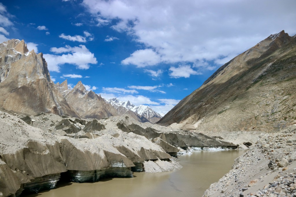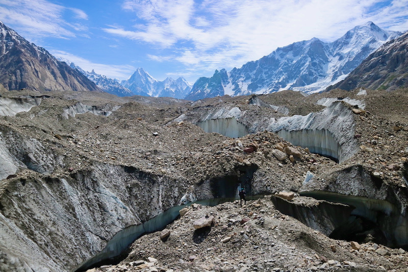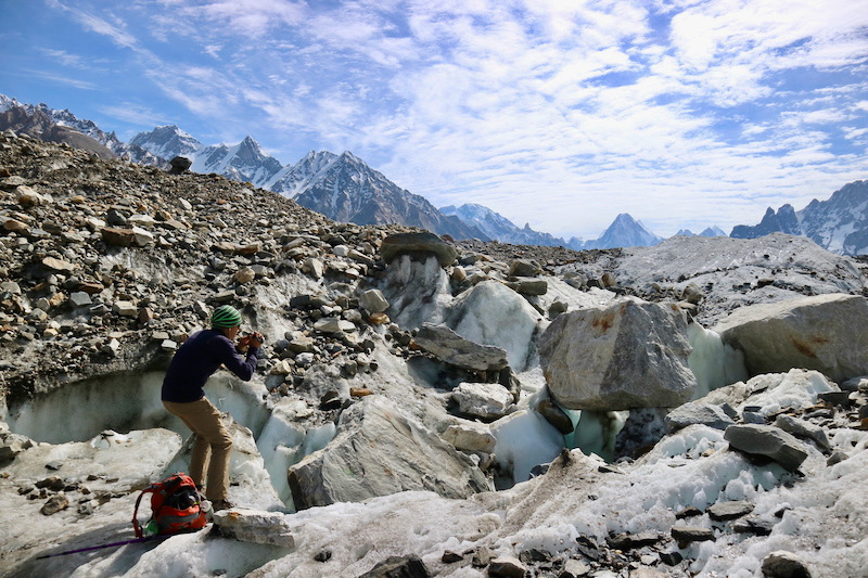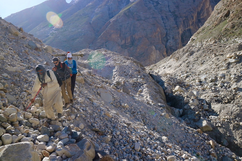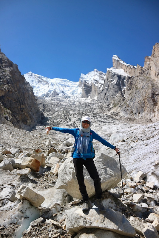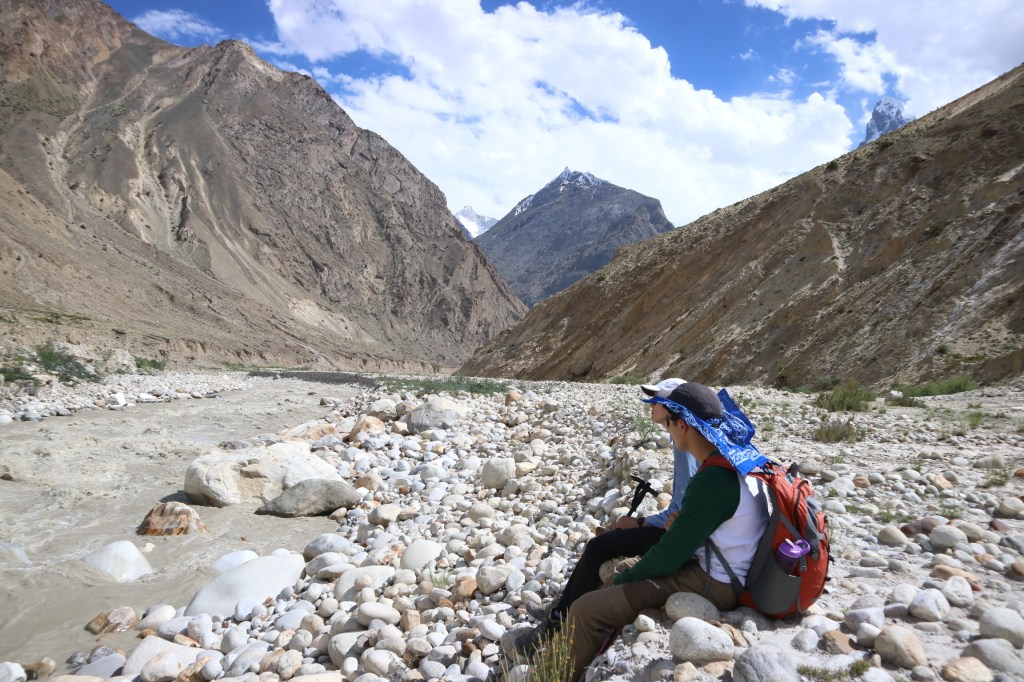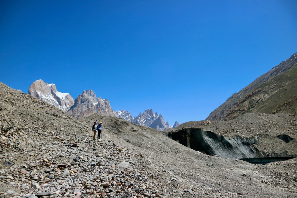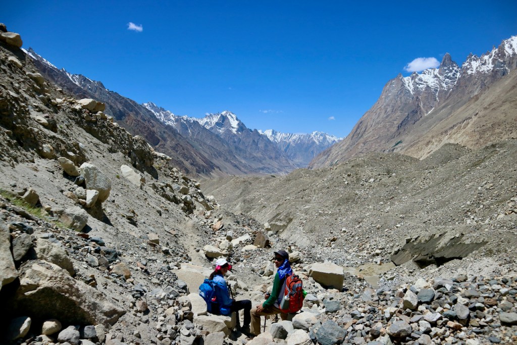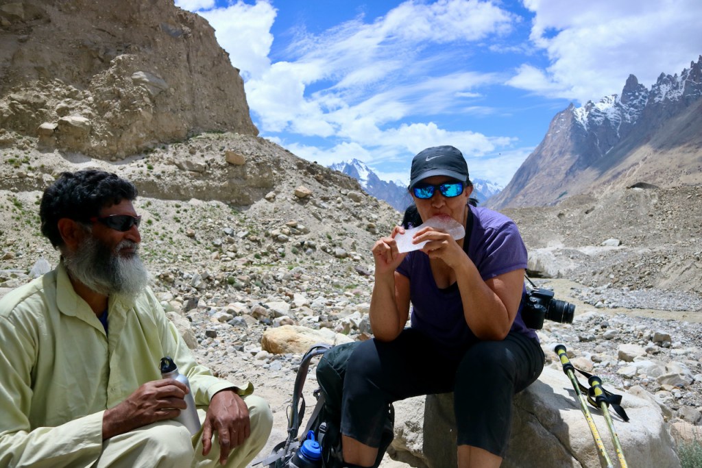 It’s supposed to be a short day trek, about six hours. The sun beats early in the Karakoram. At 8am, M, who’s now trekking with us, is already panting and moving slowly. During the entire day, our guide, Hameed, would be attending to her overheating problem by sourcing glacial water, wetting her cap and tank top, and even carrying a piece of ice for her to suck on to prevent a heat stroke…!