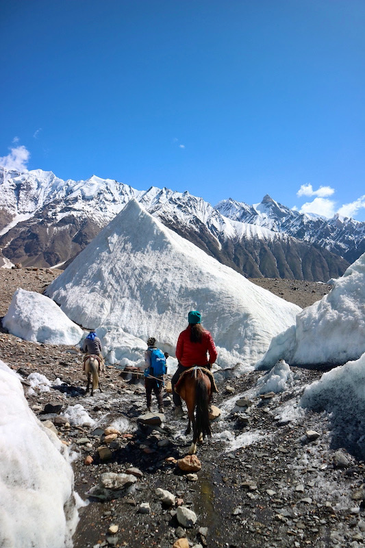 On our way down, we see Y and M from the other trekking party. They look exhausted from their day trek to K2 BC and are not continuing to Gondogoro-la, not for the lack of will or strength, but their guide said he had no “rescue team money” (not true) and their porters refused to go. Seeing us riding horses with big smiles, M says, I would not take a picture with you, cheaters!