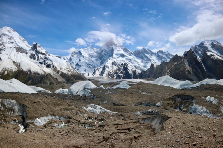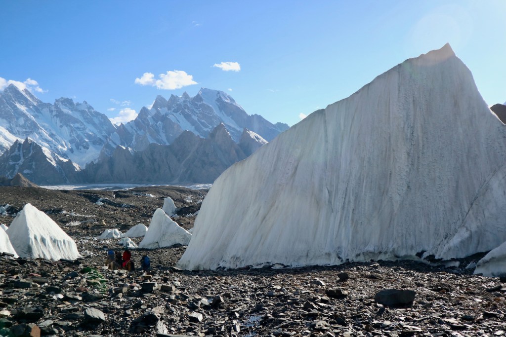 5am wake up call. A long trek to Goro II. It is the most beautiful day so far, with the mighty Baltoro twisting and turning, forming surrealistic ice caps and islands along the way. First glimpse of magnificent Broad Peak finally! At 4000m plus altitude, each step is a little labor, but the landscape is so mesmerizing that you just keep plodding on!