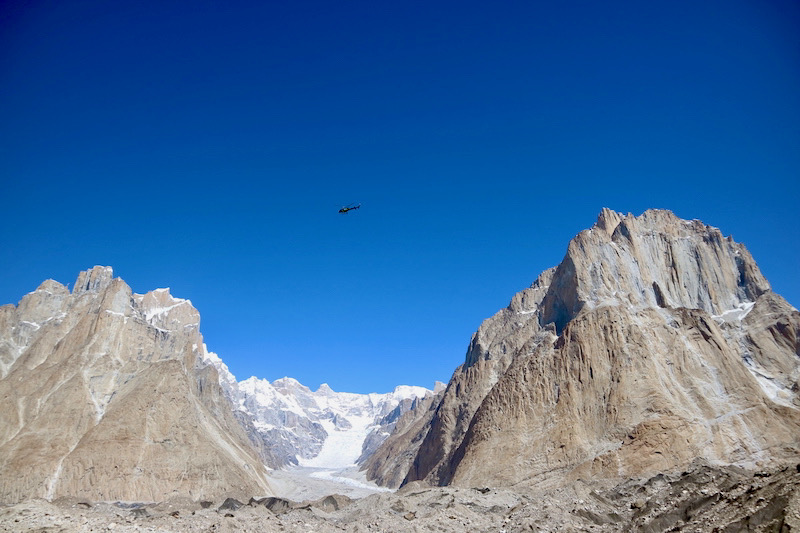 Army helicopters shuffle along the valley. We heard that it would be K2 summit night and that several teams are already at Camp 4. Perfect blue sky.