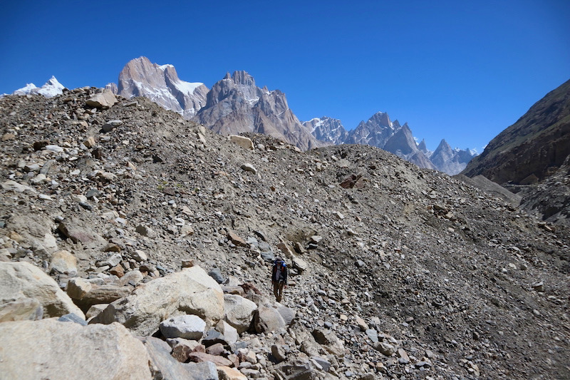 Panic is not the right word to describe how I feel, as our guide is still with us. It’s now 4pm and we still have three to four hours more of daylight. We have walked for ten hours nonstop without lunch. At one point, Hameed, panting, sits down on a rock, trying to find a route to reach the high stonemen with his eagle eyes. It is not a reassuring sight. I make a mental check of my day pack: I have my down jacket, a bit of water, and snacks. I could spend a night here in the open on the Baltoro if need be…