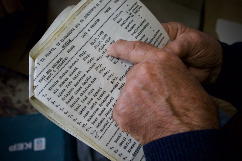 Whenever the Serbian army approached, we would flee to the mountains, Selim continues. Most of the women and children went to hide in the mountains of Cicavica. One day, the Serbian army gave us an ultimatum to leave the village by 5pm. We had two hours to cross into Albania. The border was really dangerous. I was asked for my ID that I had buried in the ground en route. If I said I was from the Drenica valley, there was 99% chance they would kill me. I told them I was from another region and gathered about a total of 200 deutsche mark from the villagers to the border police. They let us pass and I went to Albania as a refugee. A total of 125 villagers were killed and many more wounded. I still have the registry…