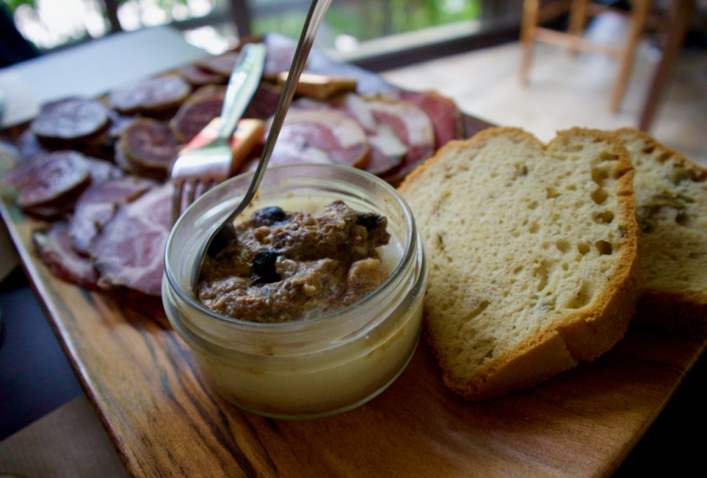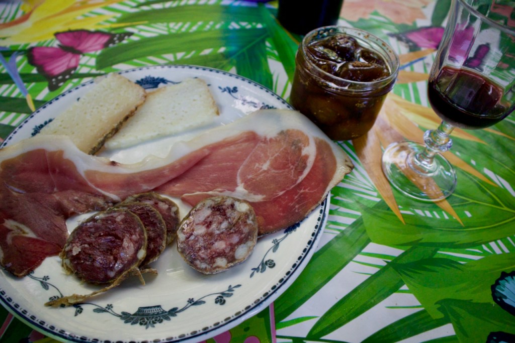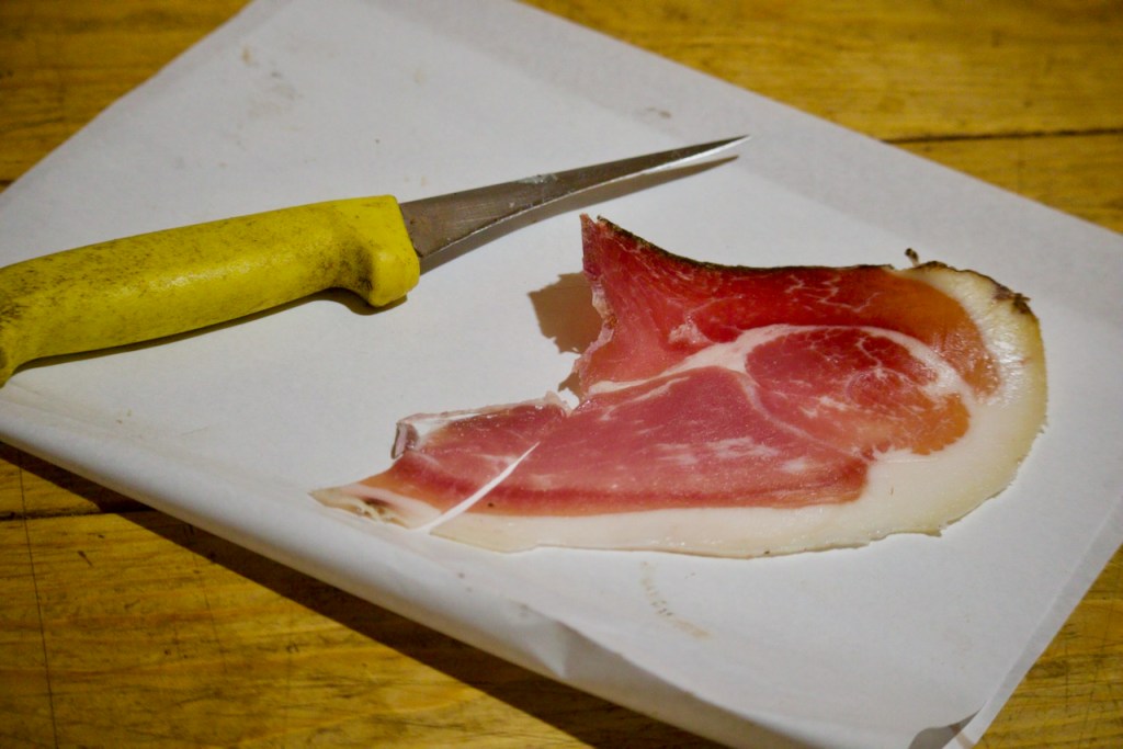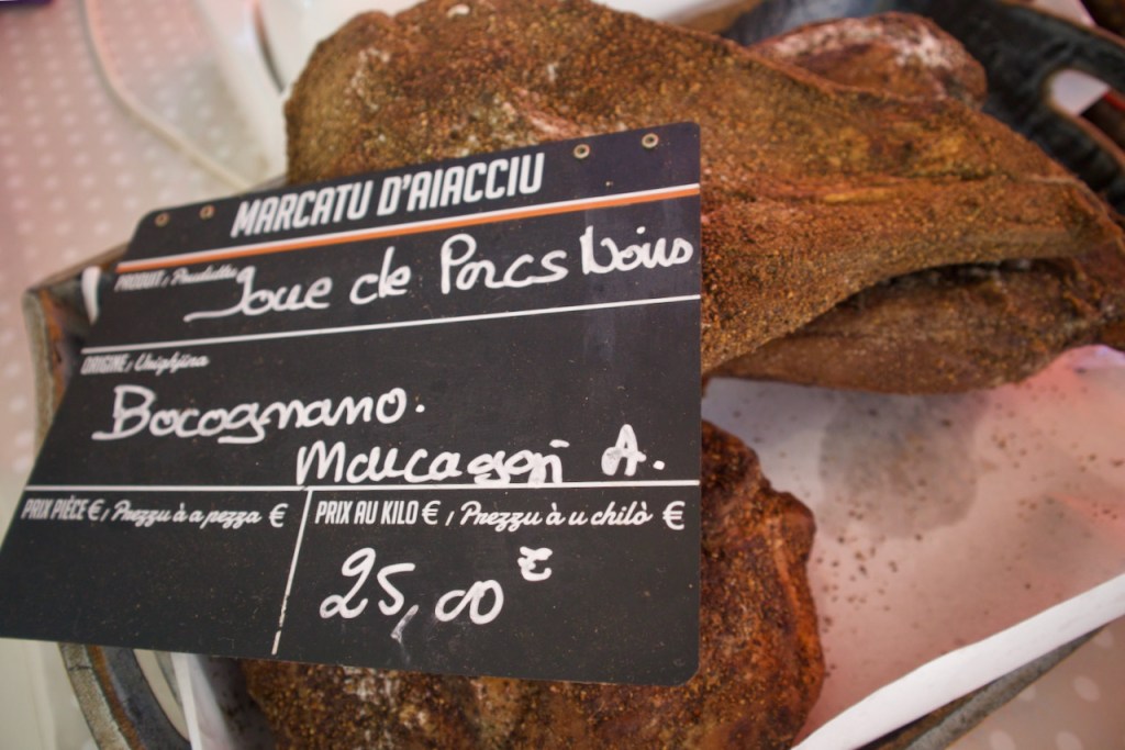 The next morning, we go meet Michel, the local breeder and pork butcher, in a dense cave where his riches are on full display. The cured ham and saucissons are so famous that people come from out of town to order their provisions. I only go to places where I can be sure Corsican pigs are raised, my friend says. If you get figatelle/pork liver sausage off season, something is fishy about the piggy! Marie-Michelle, the daughter, cuts slices of ham and cheeses for me to taste. Now, I have aromatic Corsica on my palette!