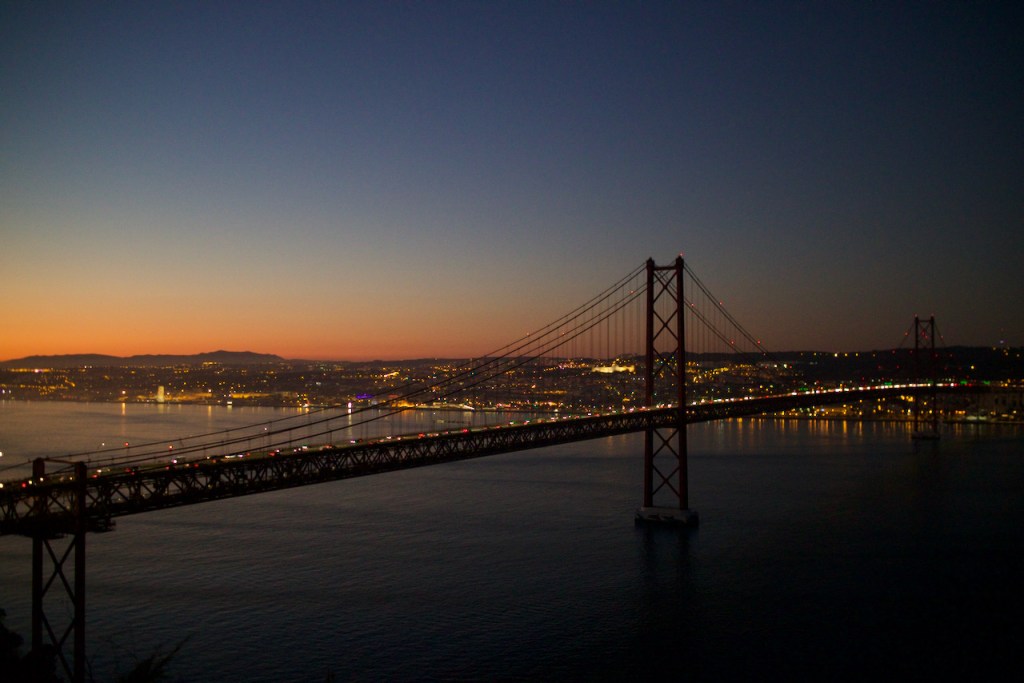 Twilight in Lisbon is a pure delight. From Alfama, I walk down to Baixo, the downtown area, and take a ferry across the bay to the imposing statue of Christo Rei. What a palette of colors, from Lisbon all the way to Sintra!