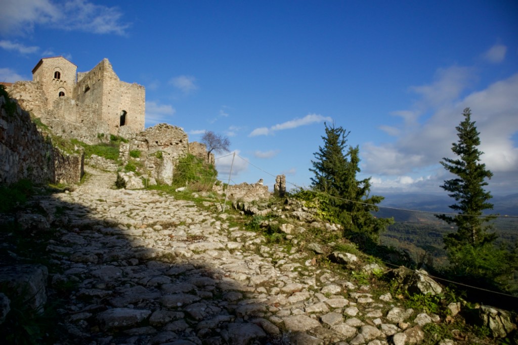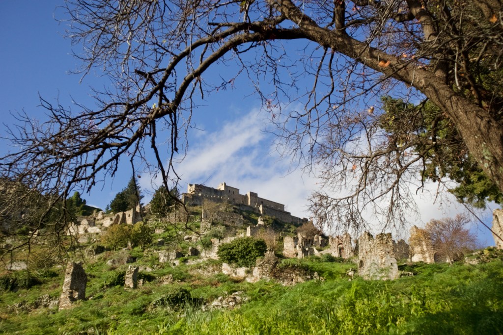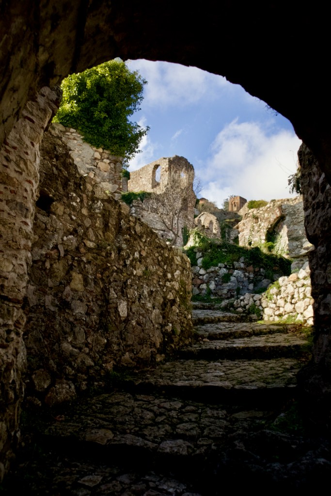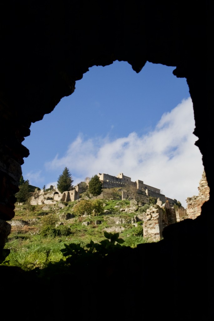 Sparta was one of the most important city states known for its athletic and military reputation in ancient Greece that reached the height of its power after defeating Athens in the Peloponnesian War (4th century BC). Today, little remains of ancient Sparta aside from some amphitheatral ruins. Twenty minutes’ bus ride away, however, lies the magnificent site of a fortified Byzantine town of Mystras. At the top of a 620 m high hill overlooking Sparta, the castle was surrendered by the Franks to the Byzantines in 1262 before being captured by the Turks two hundred years later and then occupied by the Venetians. As the inhabitants gradually moved to the modern town of Sparta around mid 19th century, only medieval ruins – and a group of nuns still living in the Pantanassa Monastery – remain in this magnificent landscape.