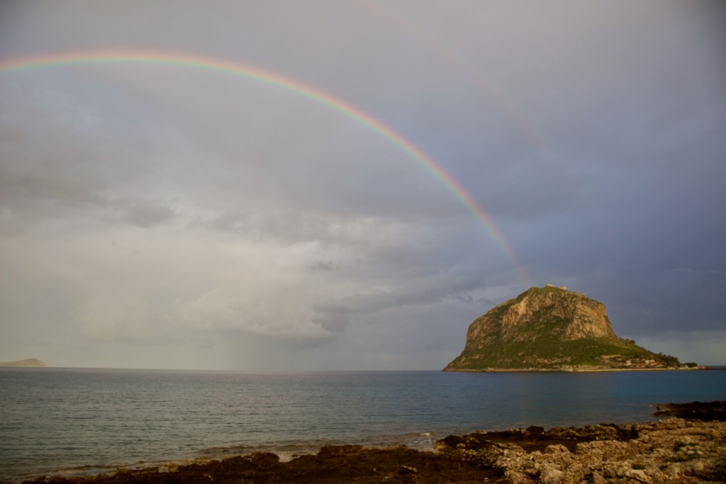 Some places have an iconic site that defines their identity. Founded by the Byzantines in the 6th century, Monemvasia is famous for her breathtaking medieval castle built into the side of a rock on the southeastern coast of the Peloponnese. A full rainbow upon arrival adds to the dramatic effect of the Rock. I can only imagine the summer beach crowd, explorations along the coast, and long, relaxing evening by the sea. Alas, a winter storm is brewing. It’s time to head back up North for the last beautiful town of Nafplio.