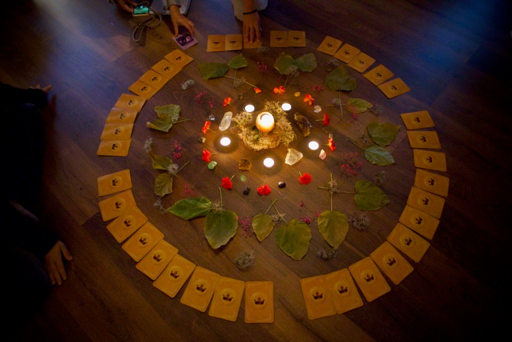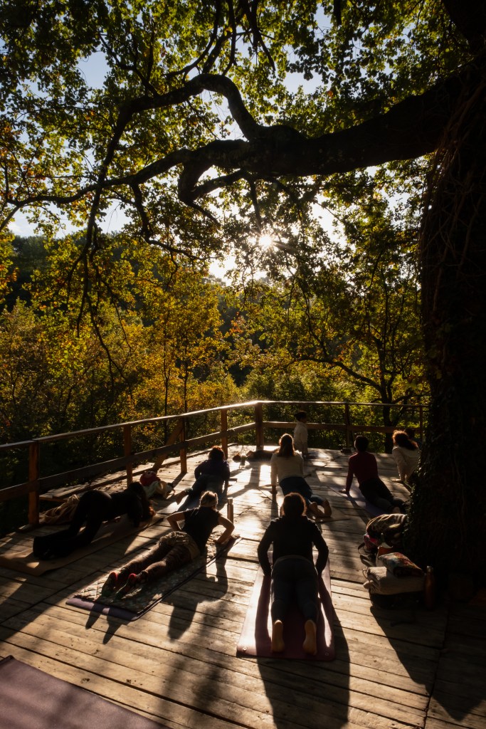 One by one, Tina, Sara, Elise, Dasha, and Radana led class, all with their full personality. Tina chose the theme of introspection and introduced a beginner’s sequence through cat to warrior poses. Sara combined her interests in taro and yoga, drawing a card on La Force/Strength – featuring a lioness with an open jaw – with a dynamic progression from chair to chaturanga, cobra, and warriors.