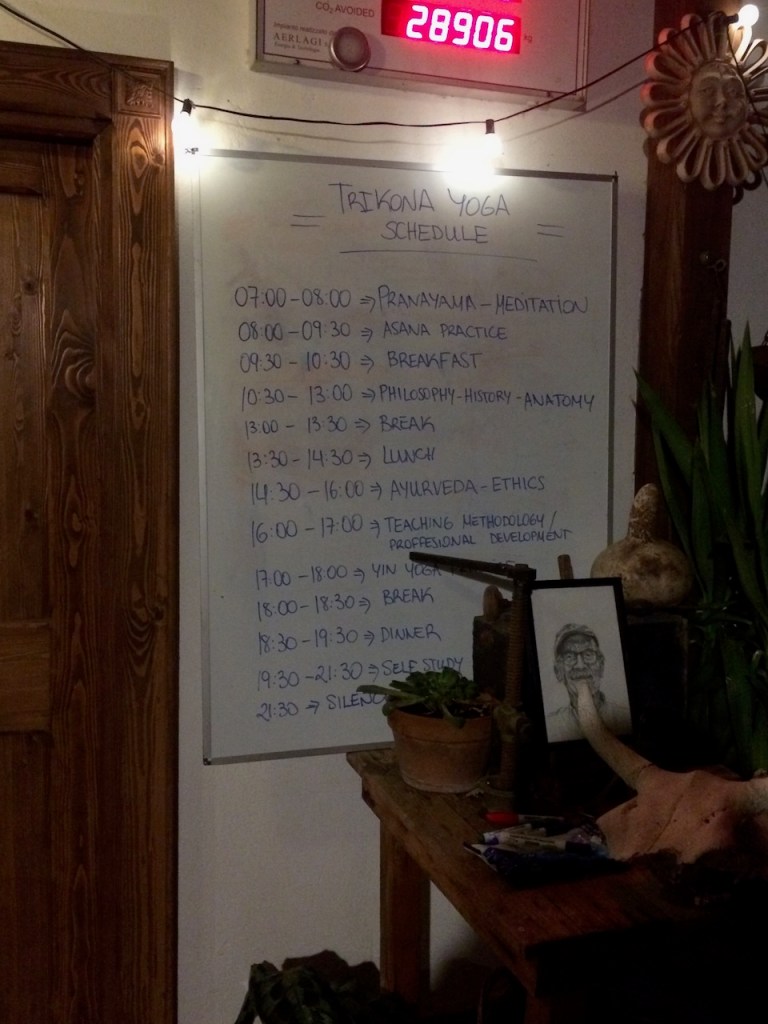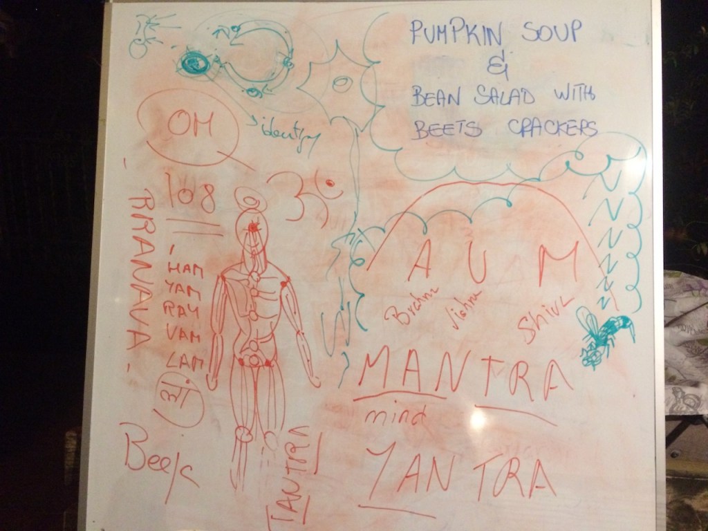 All of a sudden, I could no longer focus on my delicious banana chocolate oatmeal breakfast that Ale had lovingly prepared for us, mulling over not only the sequences and poses in Sanskrit, but also the mantras, mudras, bandhas, pranayama, and chakras. Fortunately, Jurtina, the healer in our group, volunteered to go first, giving me an extra hour to dig deep into muscle memory. I showed my sequence to Shankari and she suggested dropping Surya Namaskara. Each of the Sivananda poses including the transitions takes about three minutes. Together with warm up and final relaxation, it would be a full hour. That settled it for my first ever yoga class, at least on paper!