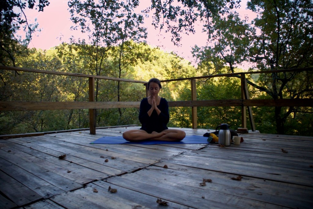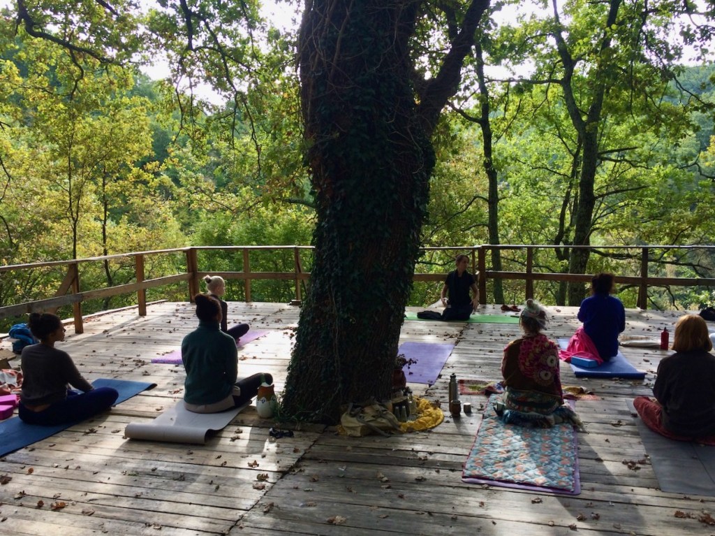 The sun was out and we moved to Yoga Hill, a dream outdoor platform in the woods. Lo and behold, Shankari led six rounds of Surya Namaskara, sun salutations. Suddenly, long forgotten memories of Gene, my awesome first yoga teacher, resurfaced in the twelve asanas still in my muscle memory, and my eyes almost welled with tears. How blessed I felt – I certainly wouldn’t be here without his gift two full decades ago. If only he knew… So much gratitude to all our teachers!