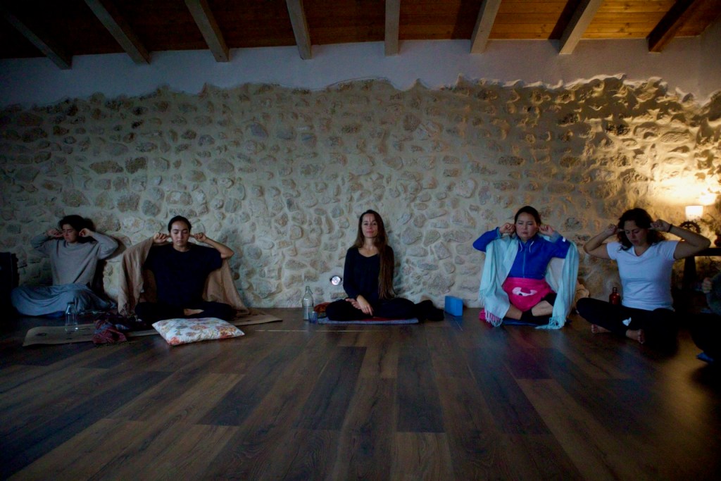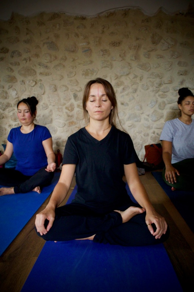 Close your eyes, the back is straight, the shoulders slightly back, the legs in full/half lotus or unfolded sukhasana, and the hands in dhyani mudra (left hand on the bottom and the two thumbs touching), Shankari, our teacher, began the meditation instructions. Inhale, and with exhalation, we make our commitment to stillness. Uh! Again, inhale, and exhale. Now we commit to the stillness of the mind…