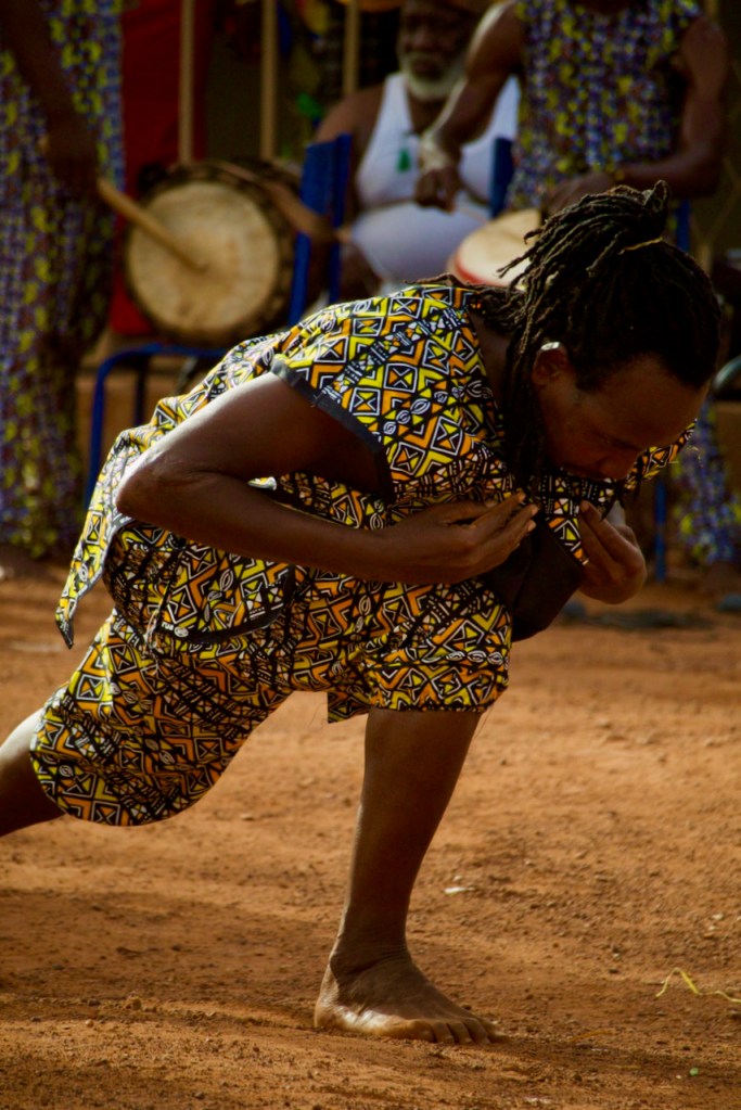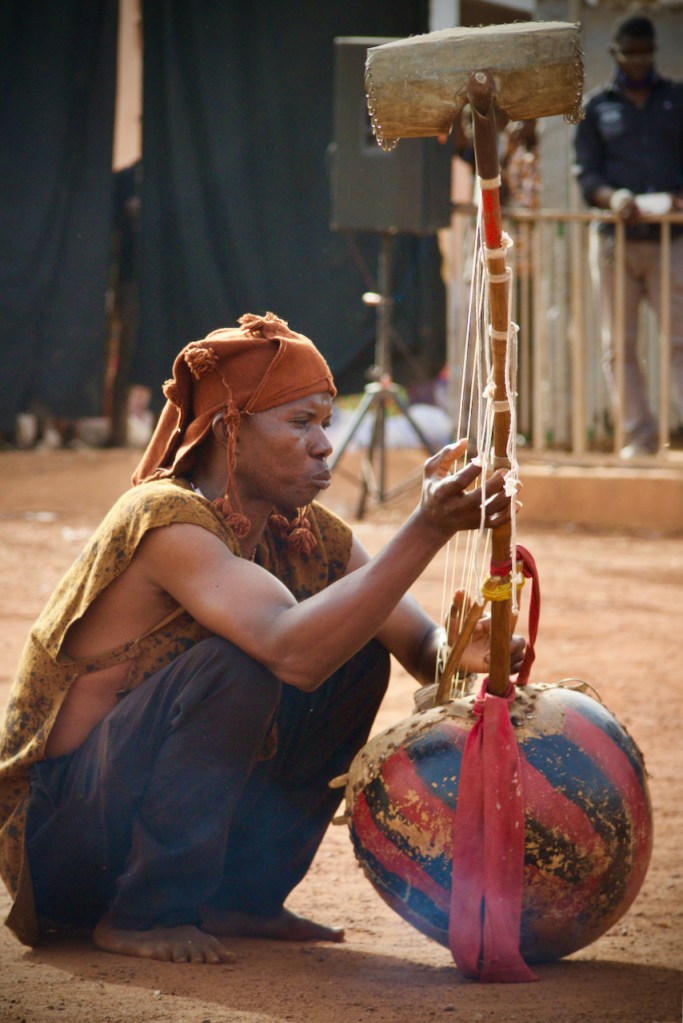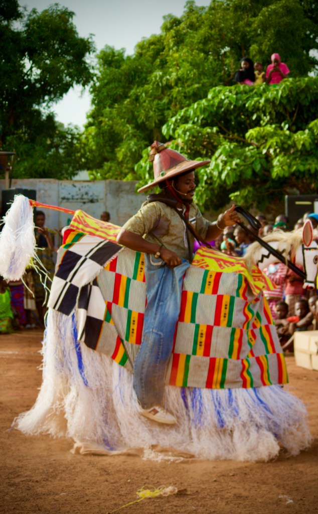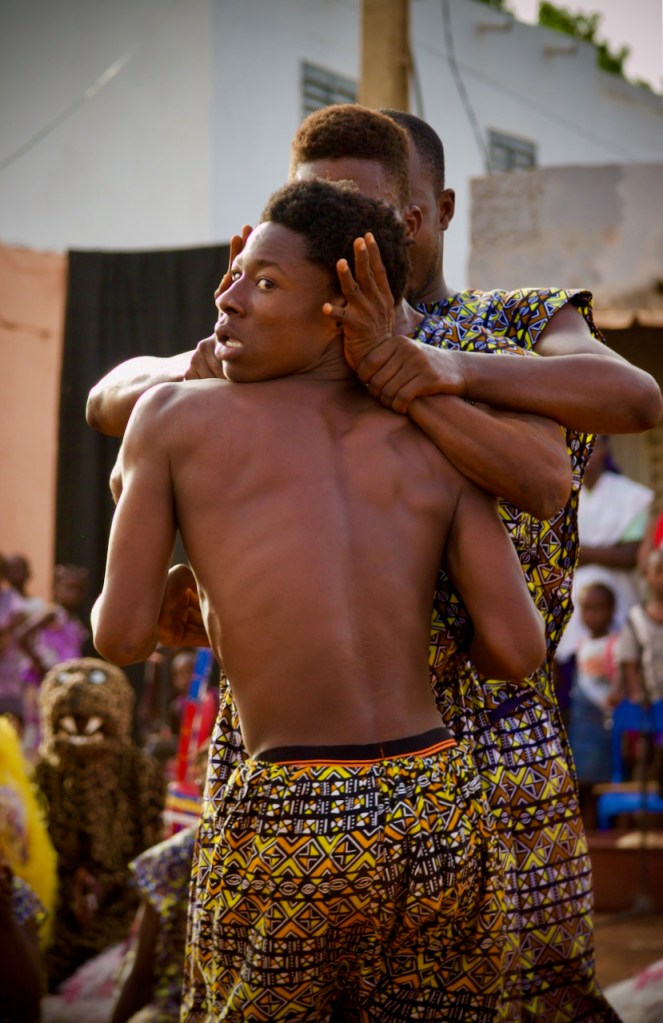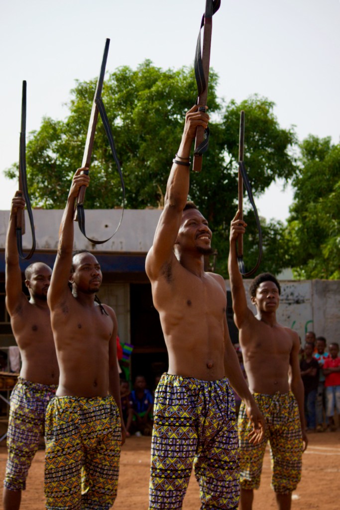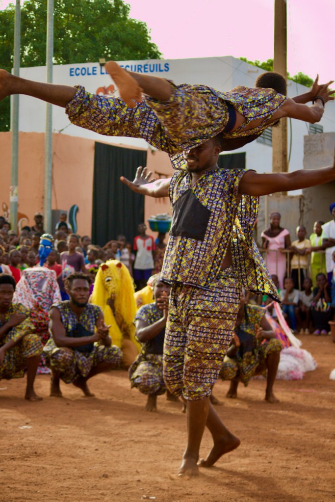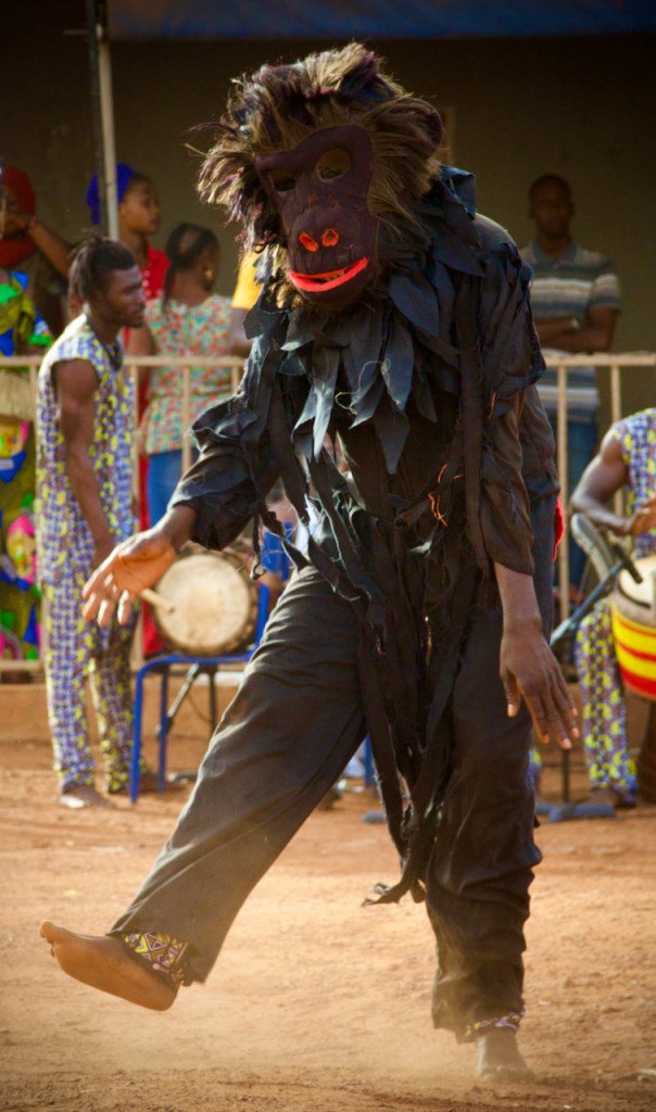 A band of boisterous musicians comes on stage before the storyteller announces in French and Bambara, “This is a fete de village/village festival! To show gratitude for good harvests and our good earth!” In succession out comes a panoply of colorful traditional characters – the lion, the hunters, the fishermen, the villagers… Oohing and ahhing, the children look transported by the spectacle.