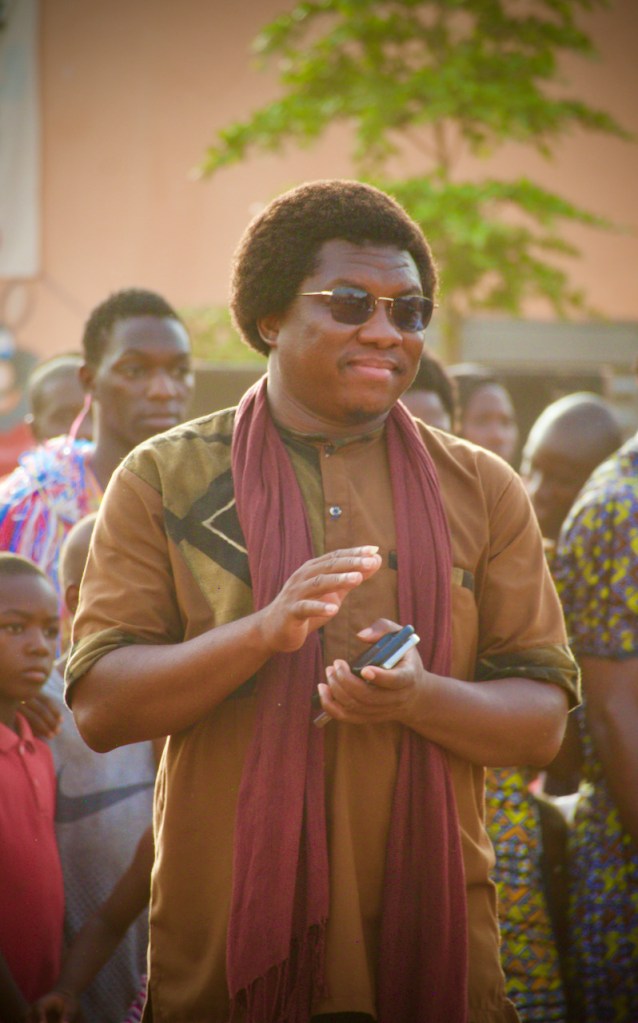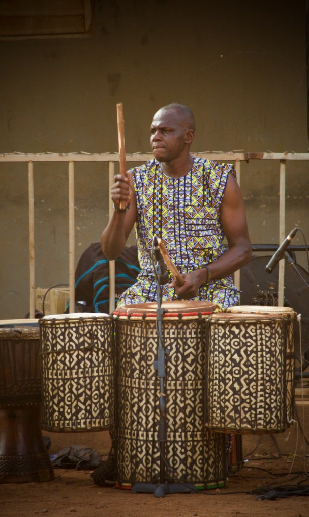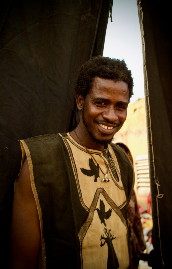 Puppet shows are rare these days in Bamako and I am happy to see such a good attendance. I make my way “back stage” where the commotion is. Behind a curtain assemble a large troupe of musicians, dancers, puppeteers, trainees, and volunteers. I ask for the puppet-master, Yacouba Magassouba, the former neighbor of my friend, Lucia, before she left Mali. It’s well past four and the show is beginning anytime now. I snap a few quick shots of the young director and the colorful wooden puppets lying inert by the window before making a beeline for my seat.