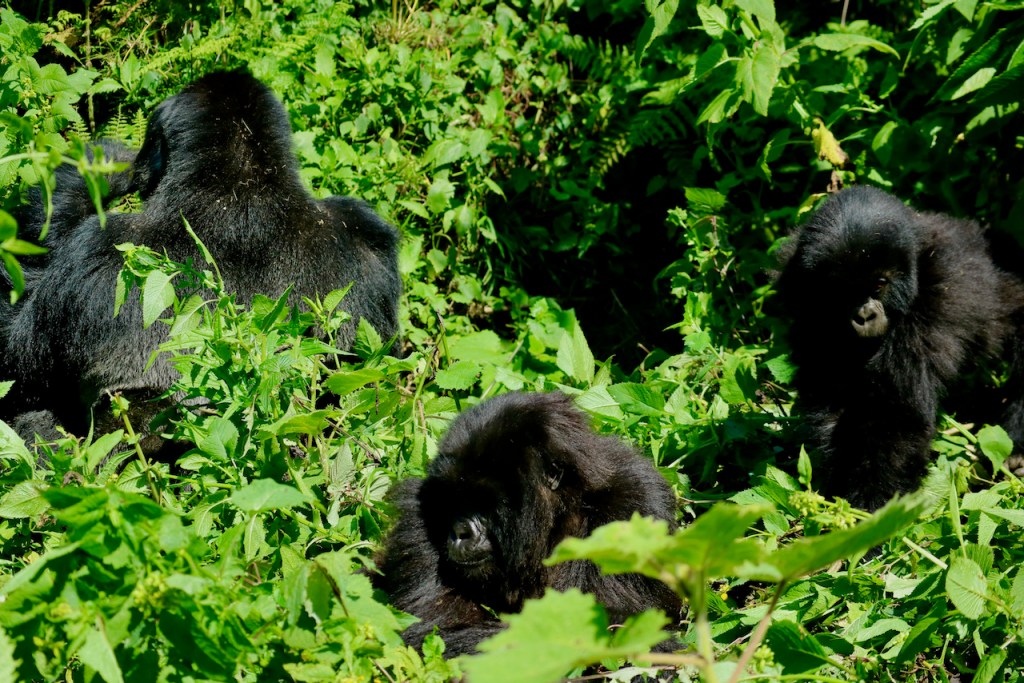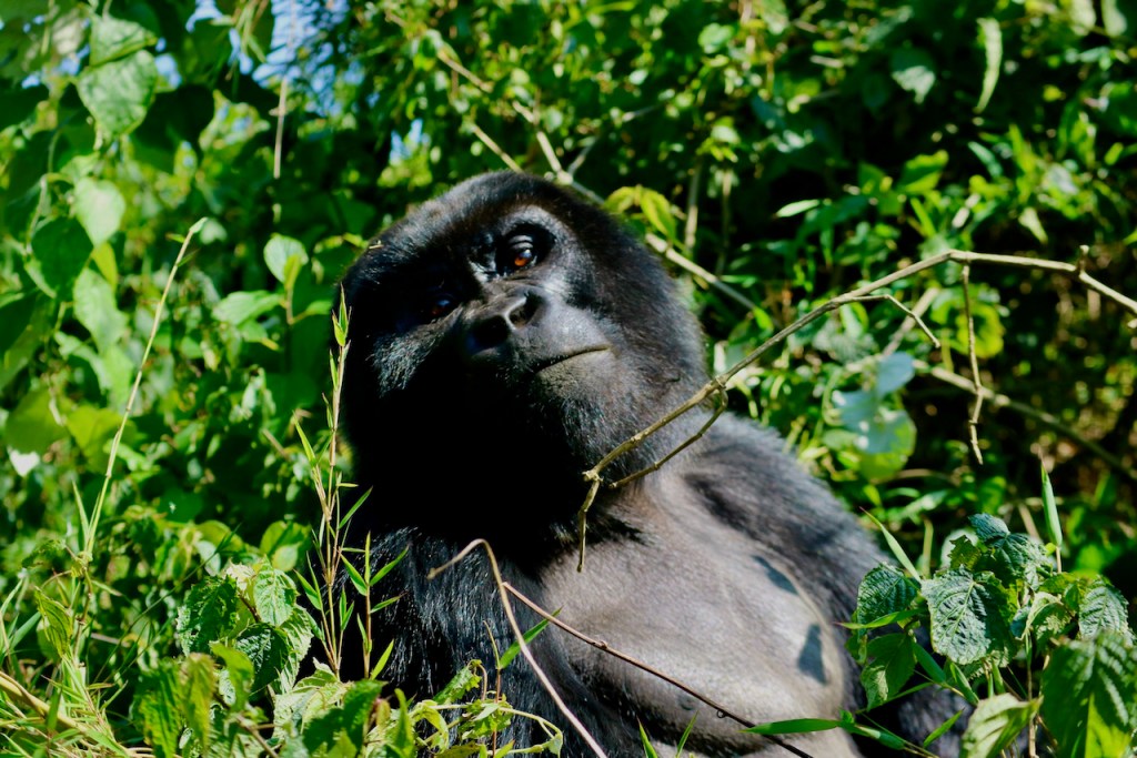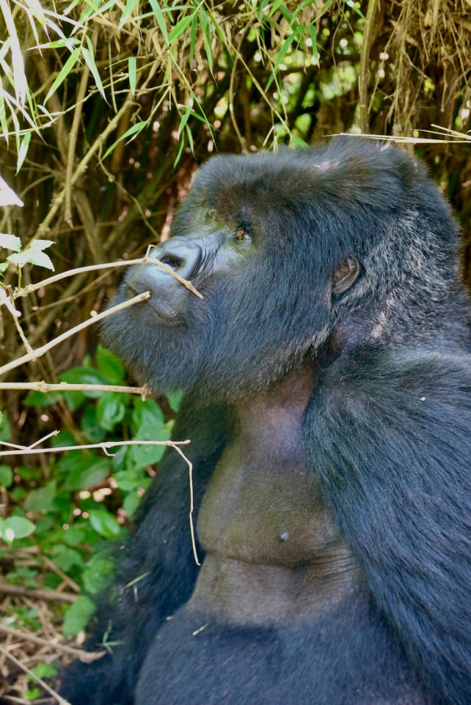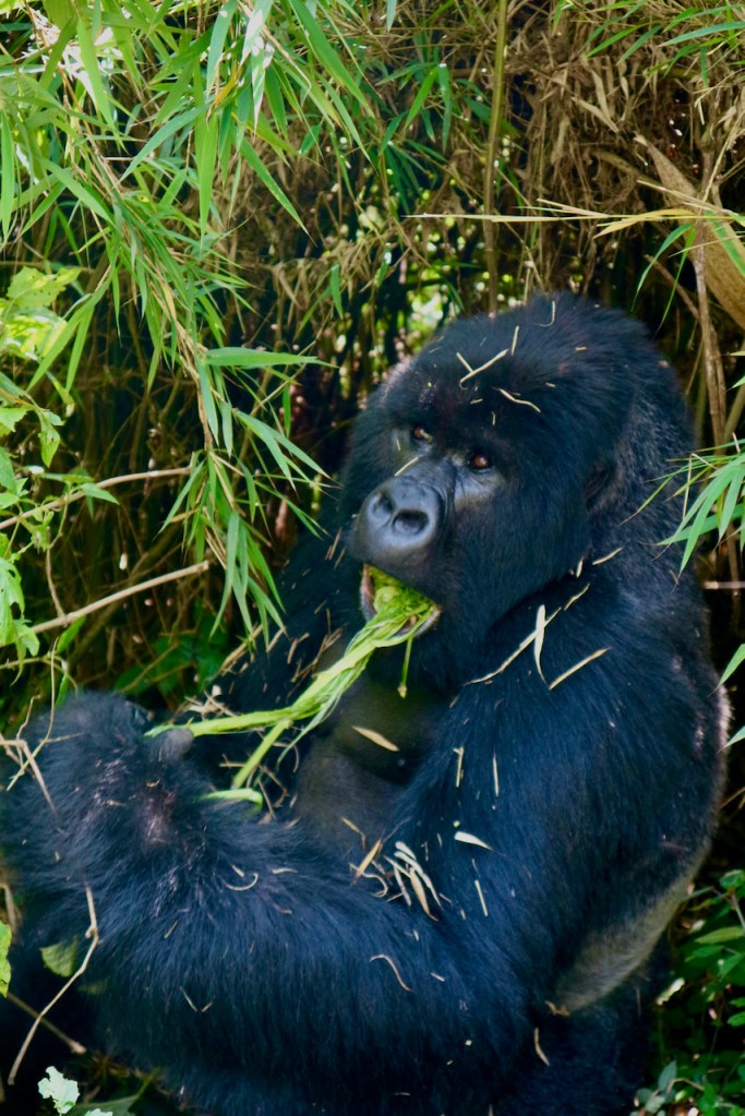 I plod along, knee-deep in stinging nettles, until Placide stops, barely half an hour in. Catching my breath and wiping the sweat off my brows, I turn my head and here he is! A magnificent, GIGANTIC male adult blackback gorilla, Berwa, 2m from me! The park regulation is to never get within 10m from one; he feels like a first bonus! He stays there, solo, for a long while, before casting a tender look my way that almost brings me to tears…
