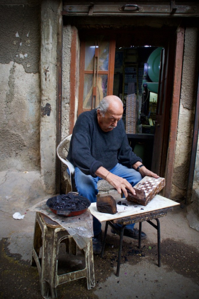 We begin our tour of the rich capital city by visiting Abu Toni, a mosaic master. Pioneered by George Bitar in 1869, Damascus mosaic is renowned around the world for their intricate designs and colours, mixing complex geometric shapes like squares, hexagons, diamonds, and triangles, and inlays of ivory, camel bone, and mother-of-pearl. The process of this dying craft seems mind bogglingly complex and time-consuming at our age of speed and convenience, but what refinement. Imagine the joy of owning a Damascene mosaic chair and/or desk. Maybe inspiration comes faster!