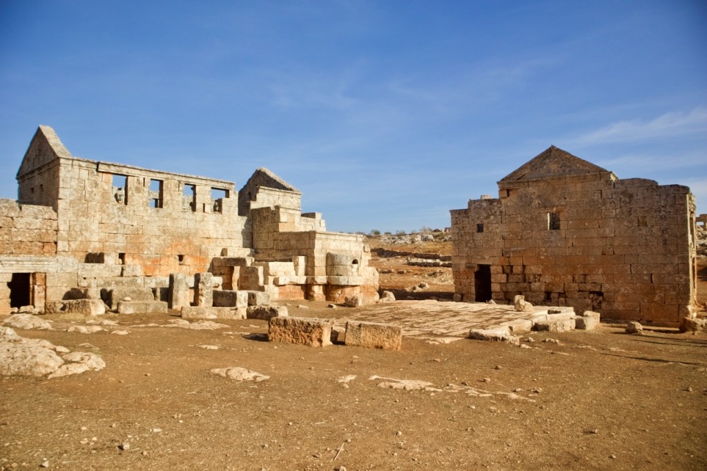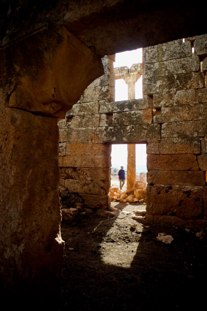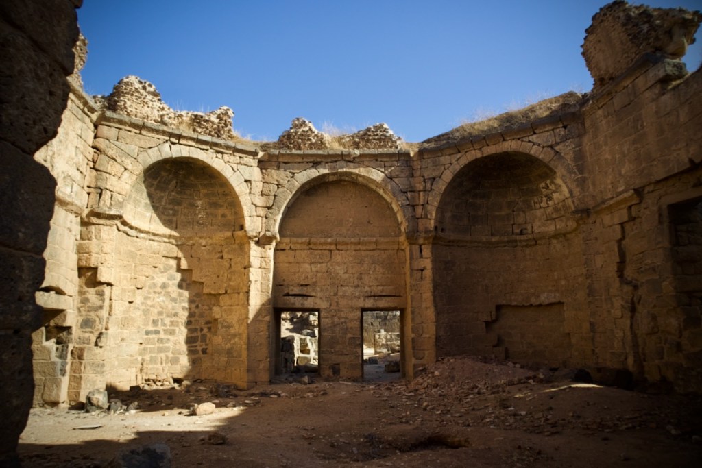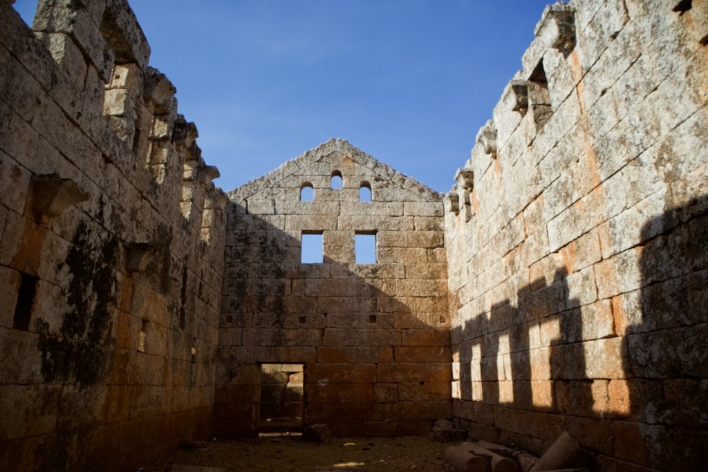 We cruise along the M5 frontline highway between Homs and Damascus, witnessing destruction village after village before we reach Serjilla, a UNESCO World Heritage site. One of the 40 ancient villages collectively referred as the “Ancient Villages of Northern Syria,” Serjilla is exceptionally well preserved as a testimony to rural life in late Antiquity and the Byzantine period. Founded in 473 BC and then slowly abandoned in the 7th-10th centuries due to shifting trade routes after the Arab conquests, it was a prosperous town that thrived on the cultivation of grapes and olives. With a villa here, a basilica there, residential houses and a bath, and a big olive press, the sprawling ruins are an absolute photographers’ paradise.