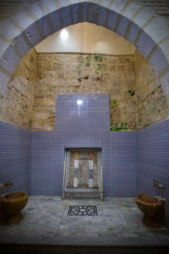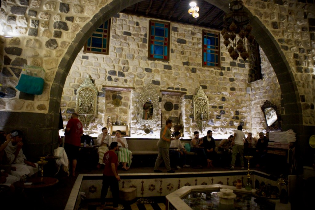 Lunch is served at the classy Al Kamal Restaurant where waitors in formal attire regale us with more delicious Syrian dips and soups, mouth-watering dolmas and stews, followed by very decadent local sweets. Damascus still has so much to offer: the Via Recta Hotel, the exquisite former home of artisan George Bitar, the charming Qishla Cafe where you want to linger without the cares of the old/new regime, the historic Jewish quarter, and the Umayyad Mosque where dusk light meets marble floor reflections with the background chants of Friday evening prayer. Allahu Akbar/God is the greatest. Rain is finally upon us! The evening suddenly turns chilly. Hammam, anyone?
