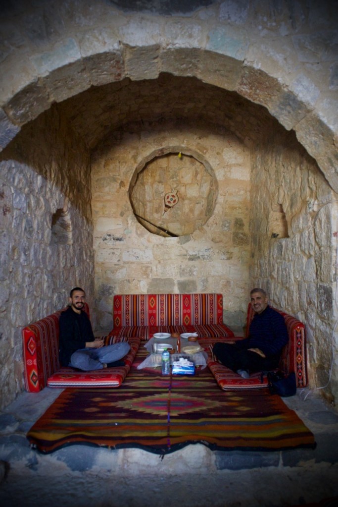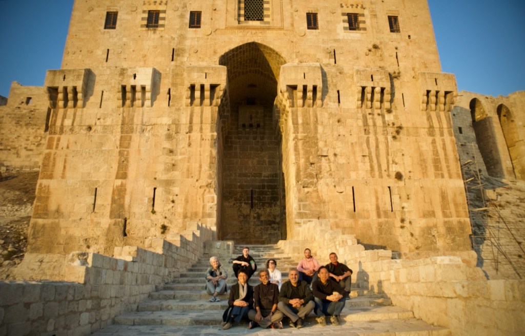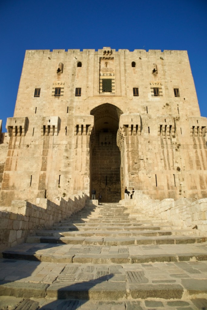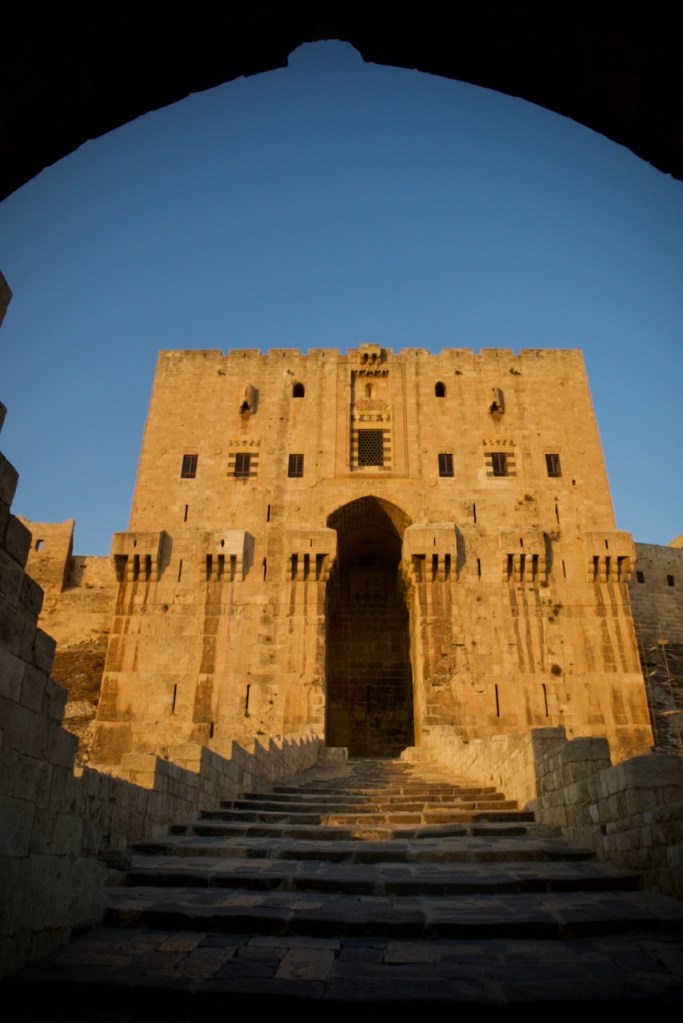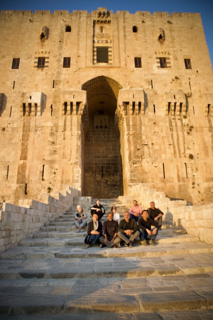 After our luscious lunch, we reach the citadel at four in the afternoon when visitors are piling out, leaving the entire castle for our private tour. What a privilege! One of the oldest and largest in the world, used for military purposes for over 5000 years including during the liberation of Aleppo in 2016, the fort once again stands strong despite the devastating impact of the civil war all around. As the sun sets, drawing increasingly heavy shadows across the Roman baths and the amphitheatre, finally descending on the entrance steps, I feel in awe of this old city, her resilient residents, and indomitable spirit. We end our long, unforgettable day in the beautiful home of Abdul, Bashar’s professor in tour guiding. Multilingual and multicultural, he is Aleppo soul incarnate, taking part in his role in rebuilding his native city by welcoming tourists to his beautiful place.