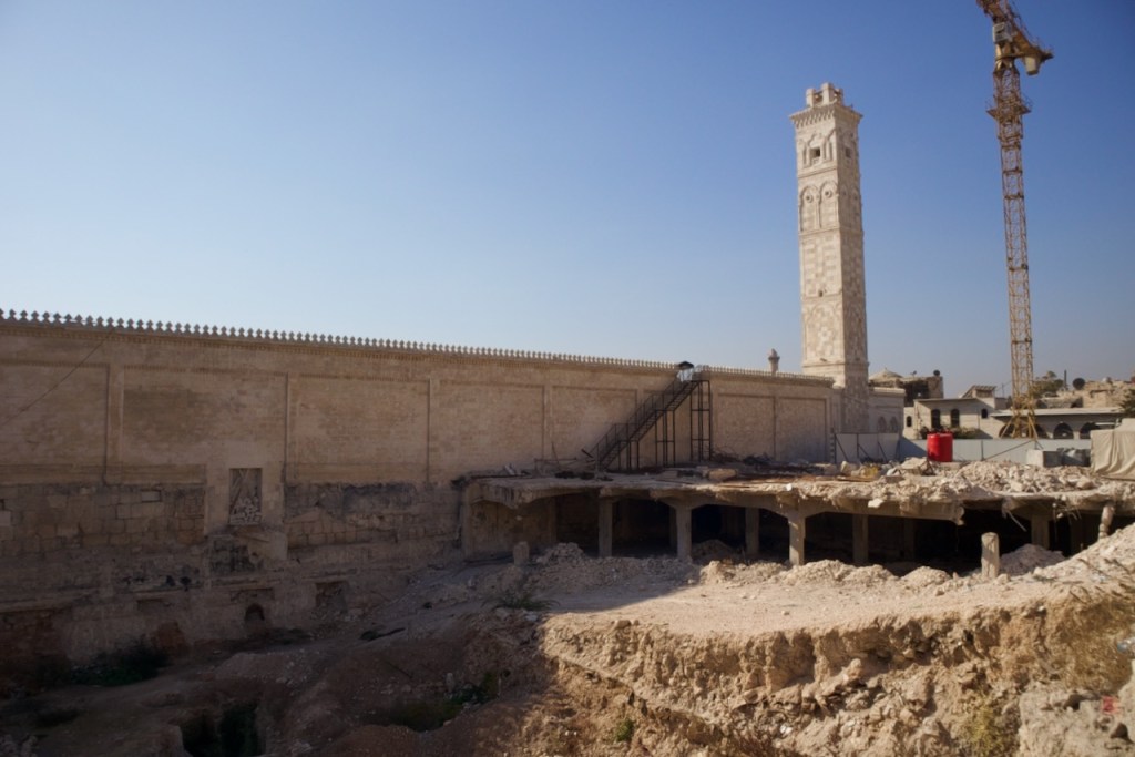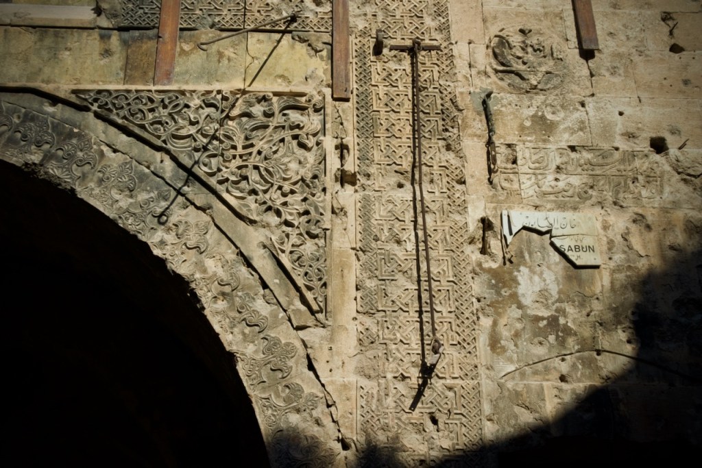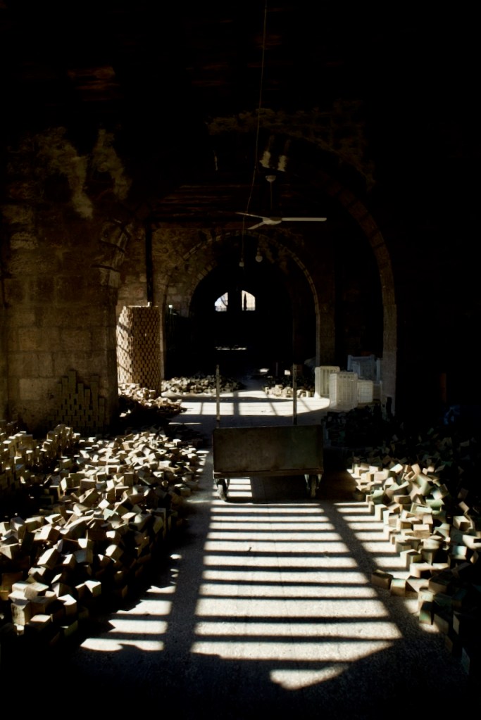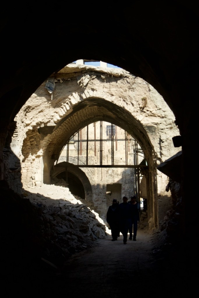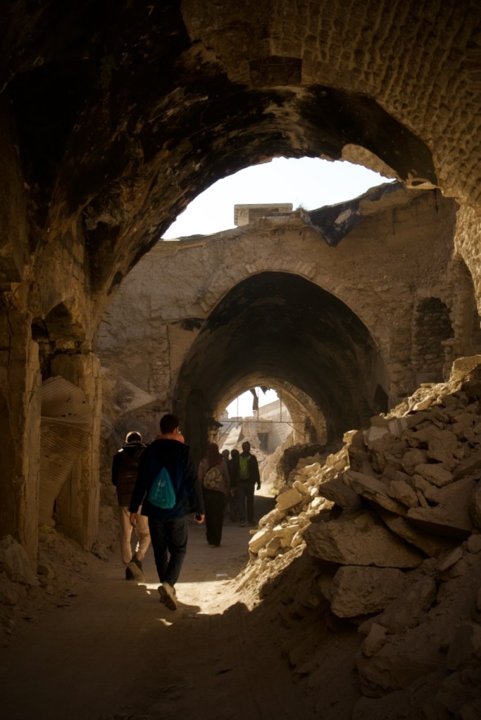 The National Museum is closed, so we move on to admire beautiful Ottoman-era mansions in an old neighbourhood dating back to the French mandate. We could not enter the Maronite Cathedral, extensively damaged during the civil war, but are happy to see it fully rebuilt and once again standing strong. A stroll through the quiet narrow alleys of the Christian quarter with an orthodox church here and a chapel there feels surreal, as three underground bombs exploded right by Hatab Square a decade ago in this frontline neighbourhood during the battle for Aleppo between 2012 and 2016. Whoever takes Aleppo wins the war, Bashar explains. What we read in the news headlines those years ago are now in front of our very eyes. Over 60% of the old city was damaged, with about 30% destroyed. Sparked by shelling, a fire in 2012 tore through the souk, destroying over a thousand shops. Standing on top of the ruins, gazing through the craters and holes, we are speechless to witness such devastation. But the soul of the city is clearly still there. Brick by brick, shop by shop, Aleppo is rebuilding.