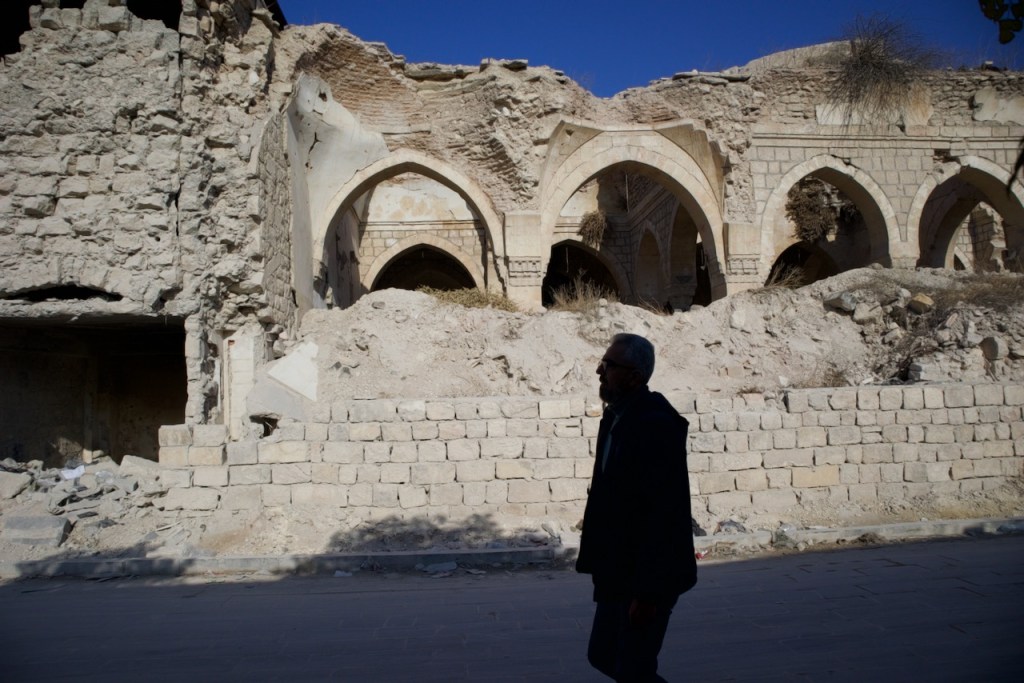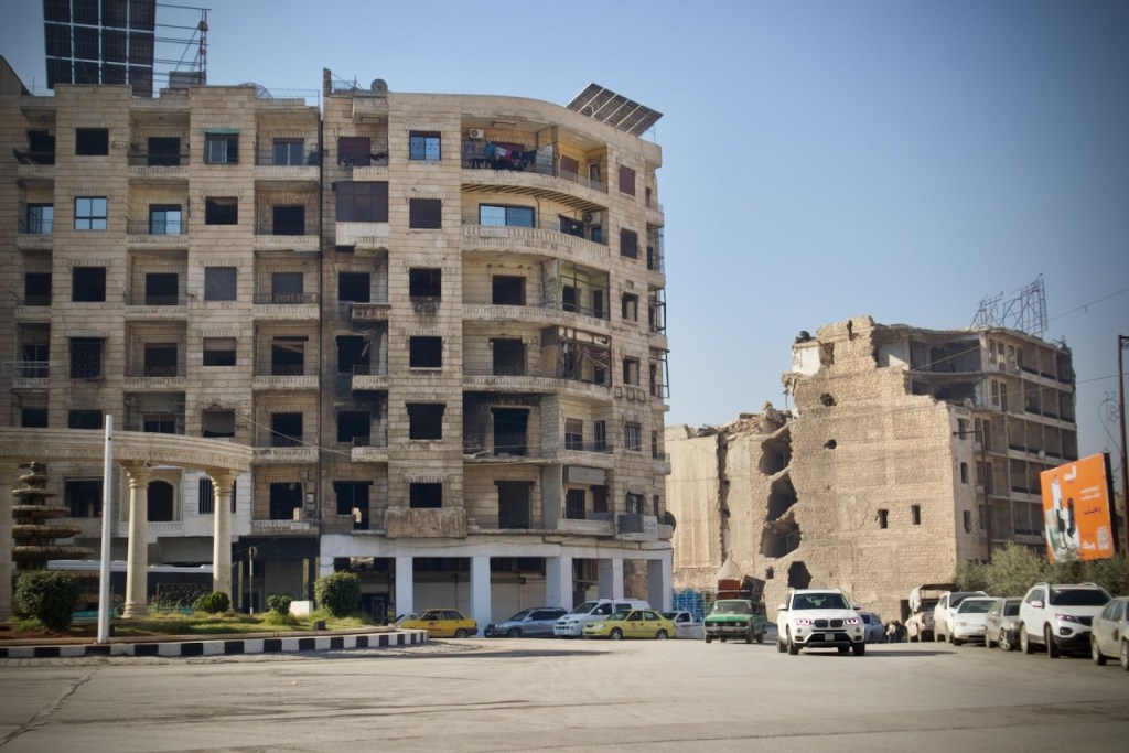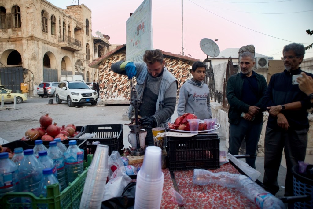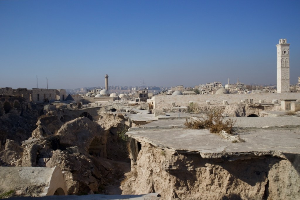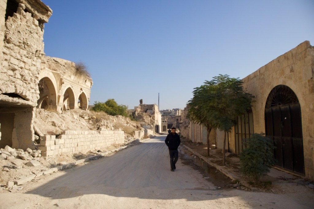 The National Museum is closed, so we move on to admire beautiful Ottoman-era mansions in an old neighbourhood dating back to the French mandate. We could not enter the Maronite Cathedral, extensively damaged during the civil war, but are happy to see it fully rebuilt and once again standing strong. A stroll through the quiet narrow alleys of the Christian quarter with an orthodox church here and a chapel there feels surreal, as three underground bombs exploded right by Hatab Square a decade ago in this frontline neighbourhood during the battle for Aleppo between 2012 and 2016. Whoever takes Aleppo wins the war, Bashar explains. What we read in the news headlines those years ago are now in front of our very eyes. Over 60% of the old city was damaged, with about 30% destroyed. Sparked by shelling, a fire in 2012 tore through the souk, destroying over a thousand shops. Standing on top of the ruins, gazing through the craters and holes, we are speechless to witness such devastation. But the soul of the city is clearly still there. Brick by brick, shop by shop, Aleppo is rebuilding.