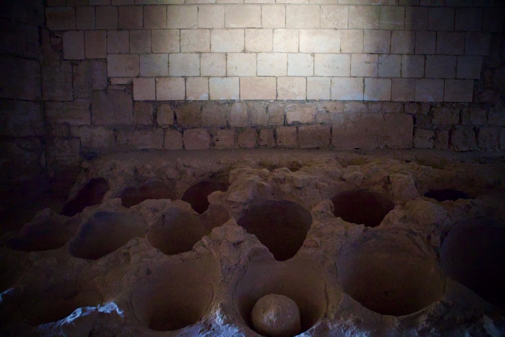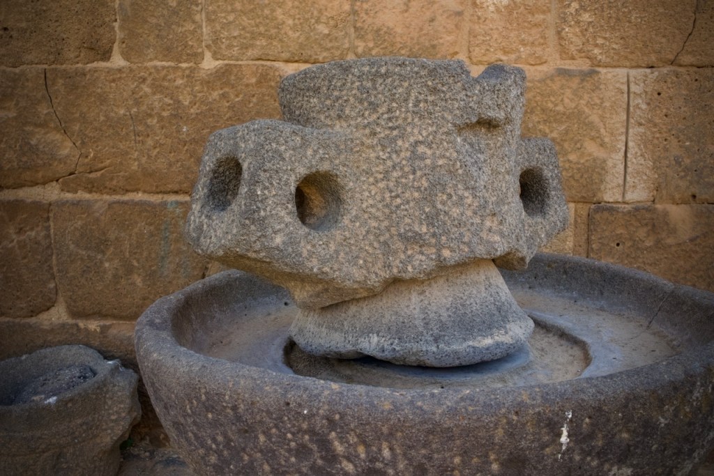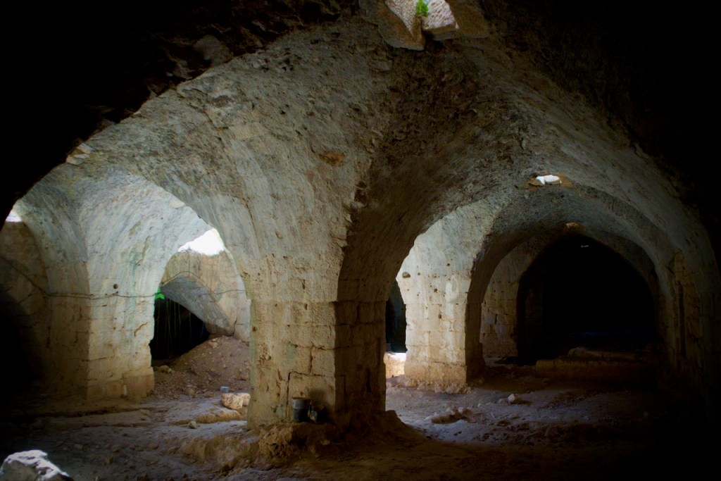 In this glorious morning amidst olive groves with mountain views, we say goodbye to our winery host to visit one of the best preserved medieval castles. Built by the Hospitaller Order of Saint John of Jerusalem in the 12th century and then further constructed by the Mamluks in the late 13th century, Krak des Chevaliers/Fortress of the Knights is an archetype of fortified architecture during the Crusader period with magnificent views. As we step into the stable and climb the defence towers, it feels surreal to imagine these very same places being occupied by rebel forces for two full years between 2012 and 2014 as a command centre and a transit base for fighters entering from Lebanon. There is always a secret path in a medieval castle!