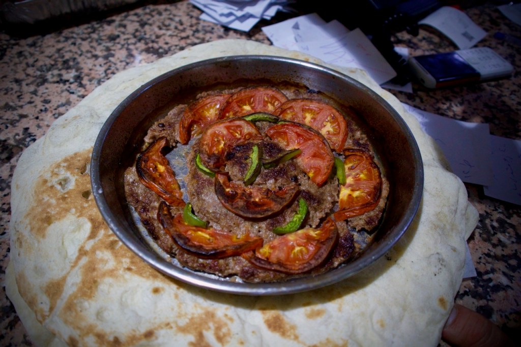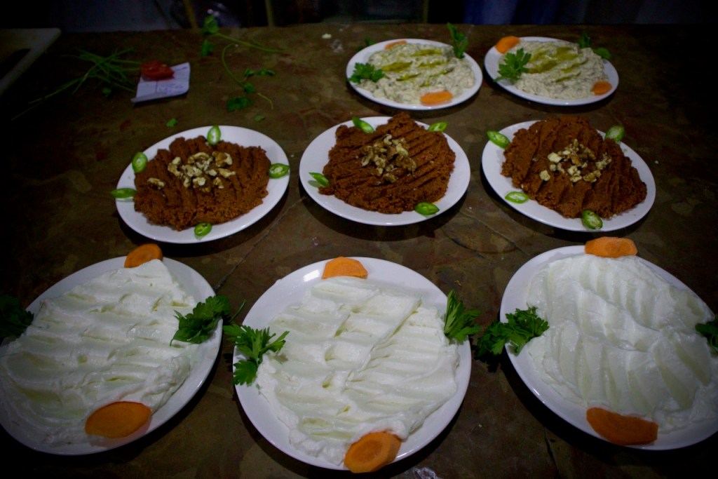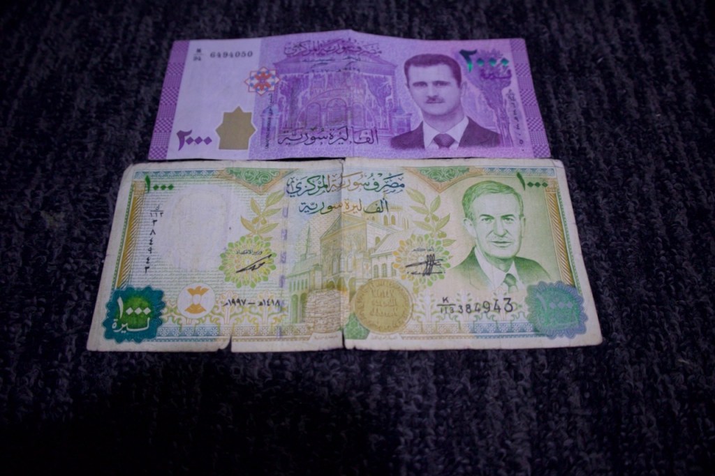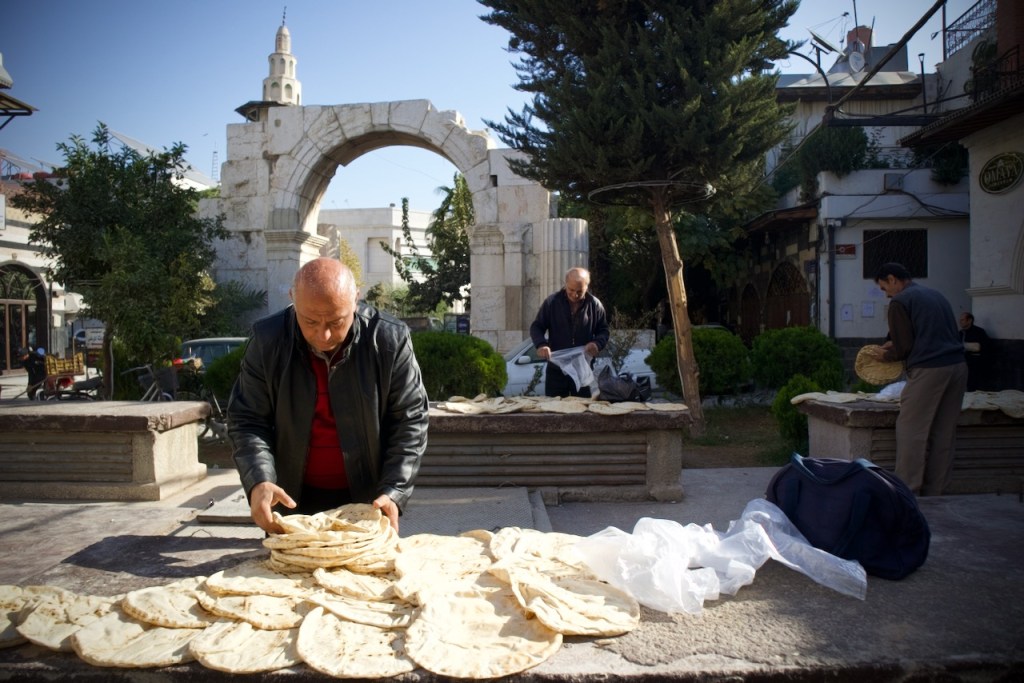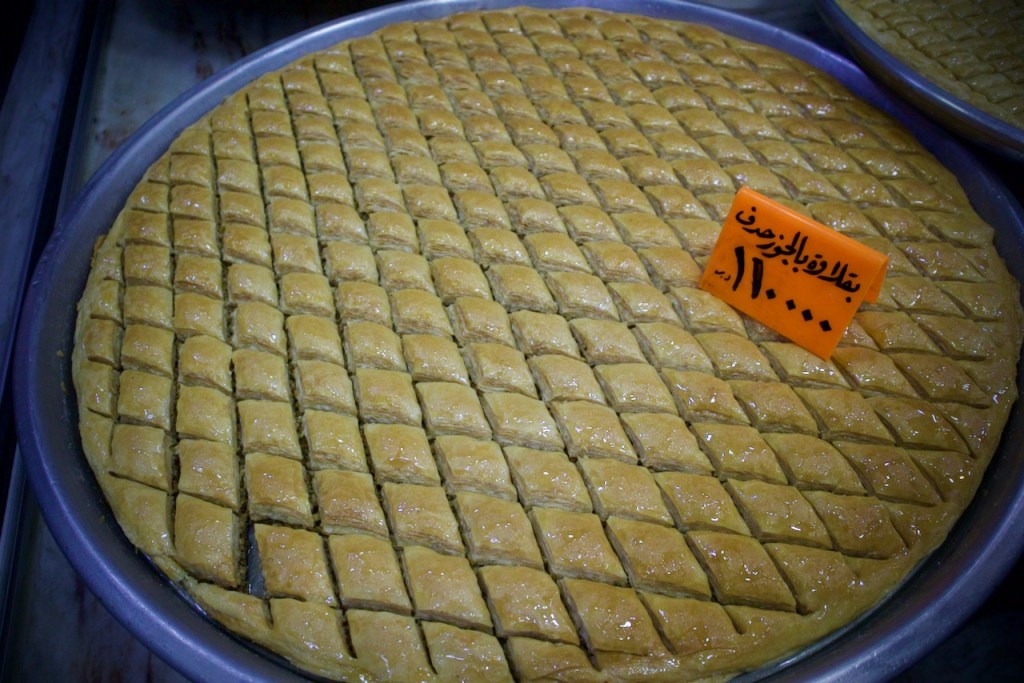 A welcome drink later, we head to Zan, a family owned traditional restaurant run by Abo Karam, for our first Syrian feast: a classic spread of hummus, baba ghanoush, and muhammara, made of roasted red peppers, walnuts, and pomegranate molasses, followed by generous portions of bulgur/cracked wheat slow cooked in a clay pot and spiced chicken rice. Night falls fast, we go to the exchange to get some local currency. Today’s rate is 11,000 Syrian pounds to a US dollar. A hundred dollars give you a big bag of bills worthy of millions. Our little brains and tiny wallets being so unaccustomed to so many zeros, how much is this again? would be the refrain for the rest of our ten-day stay.