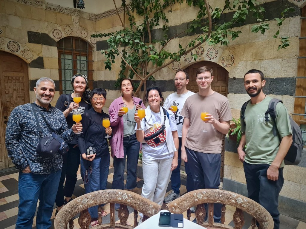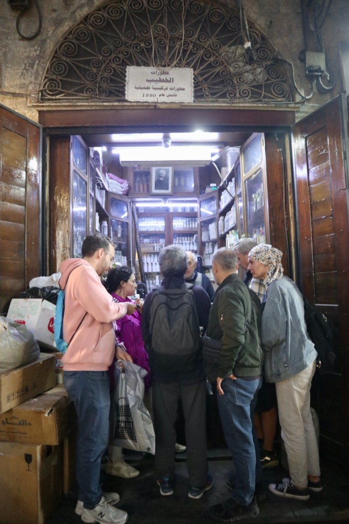 After nine full days on the road, the end is near. We spend our last morning soaking up all things Damascene. This is my favourite activity to see a city slowly awake and follow the rhythm of local life, with artisans already busy at their crafts and residents go about their new day. One more Damascene house, the magnificent Beit Farhy Al-Moalem where gold coins once filled its fountain, and another caravanserai, then we are off to the souk for souvenir shopping. Rose eau de cologne, spices, nuts, moasic… everything to our heart’s content before we bid farewell to our beloved guides – Bashar and Sarea – and driver, Mohammed, all models of Syrian generosity and hospitality.