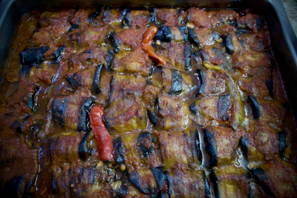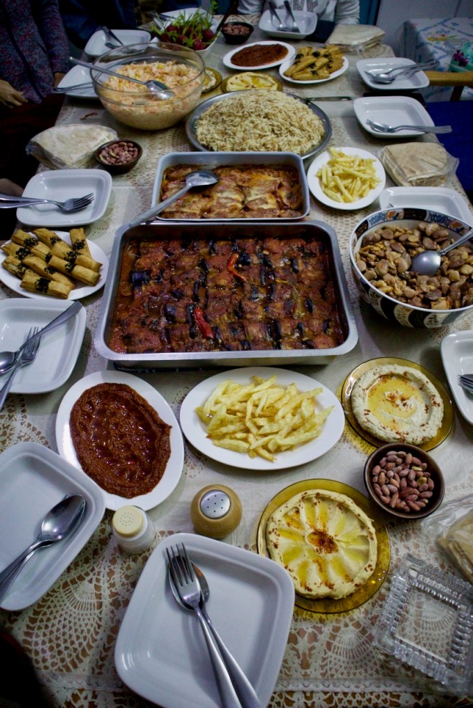 After a pit stop at Shuwaa Sweets for a quick bite, we drive towards the Christian Valley. The afternoon light is sublime, even dramatic – complete with a rainbow, crepuscular rays, and a glorious setting sun – so befitting to our visit to the holy sites. When we finally arrive chez Enam, a feast is spread before us: more dips and salads, beans and cheese rolls, baked eggplants and chicken rice, all made with hand-me-down recipes and loads of love.