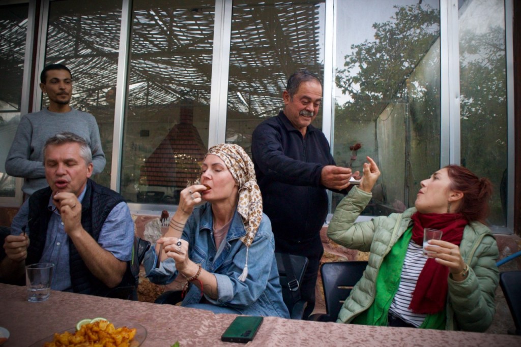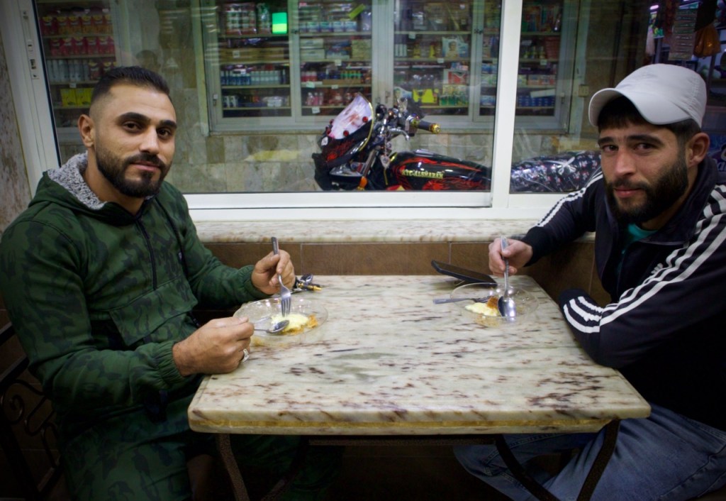 The sea always makes one hungry and the wait is long at Abo Sofwan Restaurant, as everything is made to order and grilled to perfection. I could hear moans of pleasure when chef owner Mohammed finally brings out a plate of piping hot little sausages. Legend has it that his mom used to bake fresh breads and filled pitas out of the tandoori oven for the Syrian diaspora in the US. Before the civil war, you could hardly find a table without reservation. Tonight, we are the only patrons. Everything is so fresh and straight from the garden, a secret to Syrian culinary success. After a meaty lunch-dinner, a few of us crave desserts, and Bashar and Sarea bring us for an evening stroll in downtown Latakia, passing through enchanting old cafes and the lively American Street, and tasting the famous local treat, kunafeh, made of gooey, melted cheese sandwiched between two layers of shredded phyllo dough and soaked in an orange blossom syrup that is sure to send everyone to bed with sweet dreams.