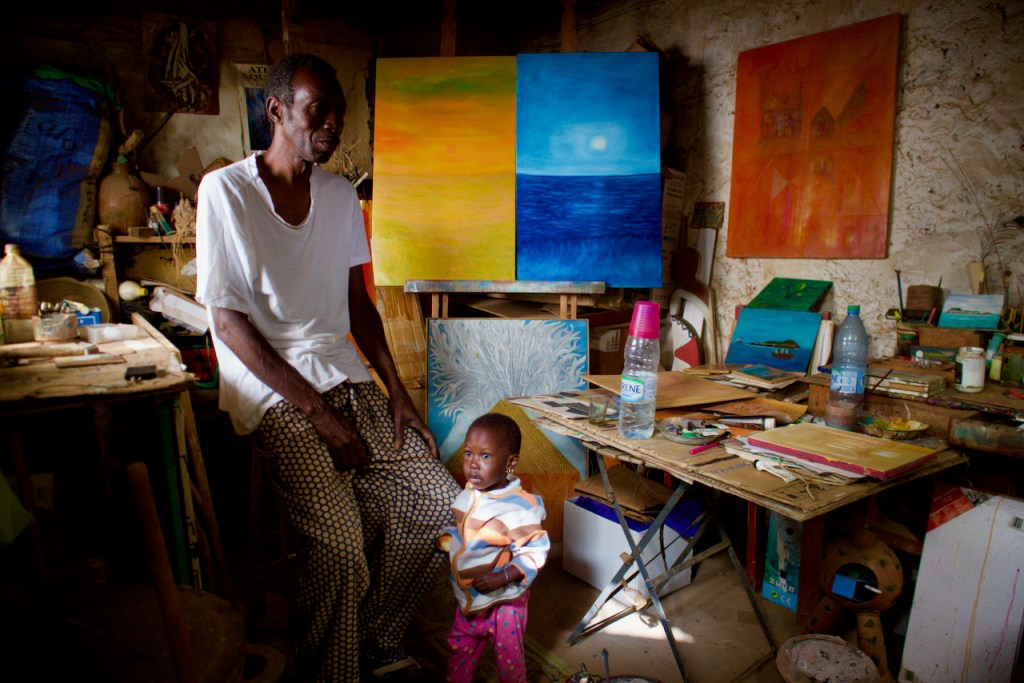 Dakar has an exceptionally vibrant art scene including Dak’Art, the biennale. The founding president of post-independence Senegal, Leopold Senghor, had the foresight to invest in art and created a rare African art colony in a prime seaside location, Soumbedioune. I meet the young and energetic President of painters, Abdul Fall, who proudly shows me his latest work, The Covid Doors, and various workshops of wood carving, sculpture, leatherwork, textile, ceramic… Opposite the village, a line of antique shops compete for the attention of a rare potential foreign client. Venez voir, pour le plaisir des yeux/come see for your eyes’ pleasures! they urge, reminding me of smiley souk merchants in Morocco…