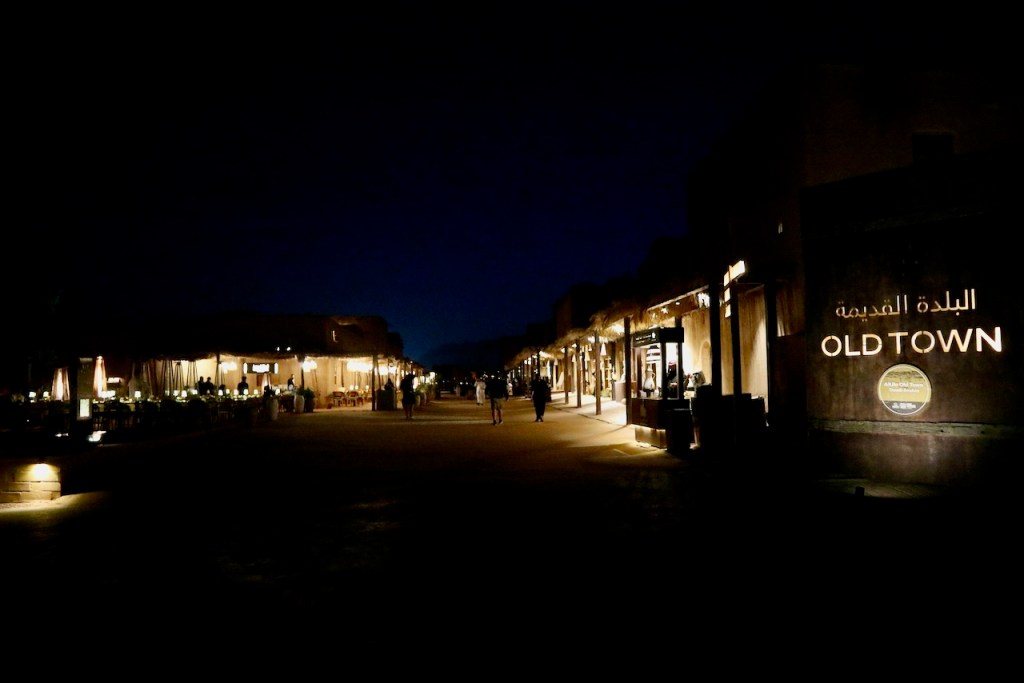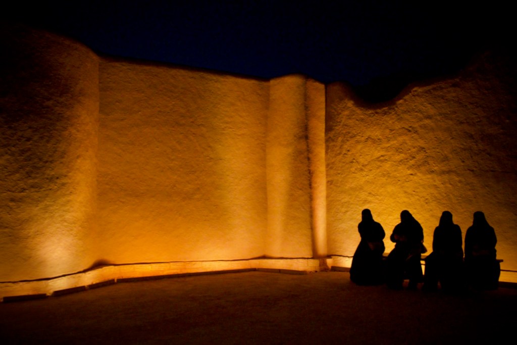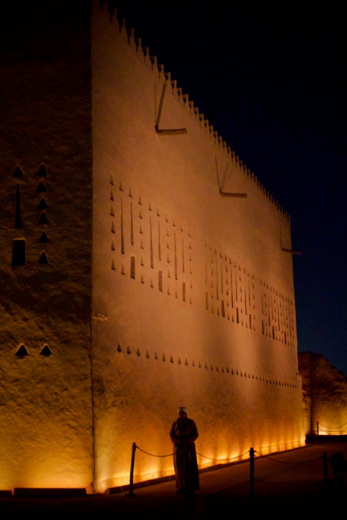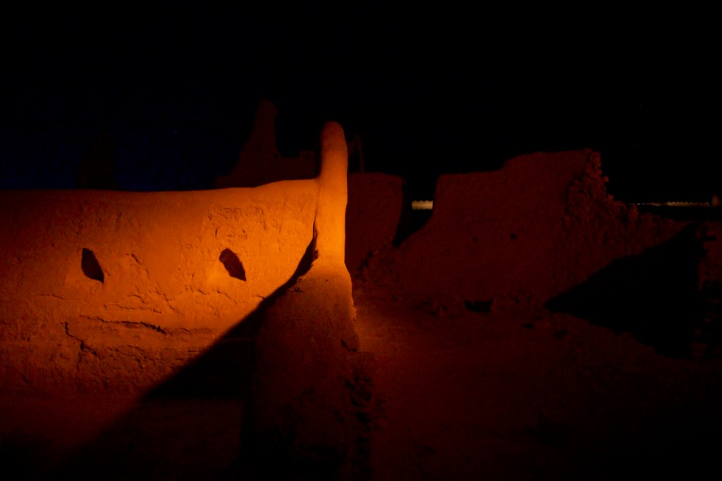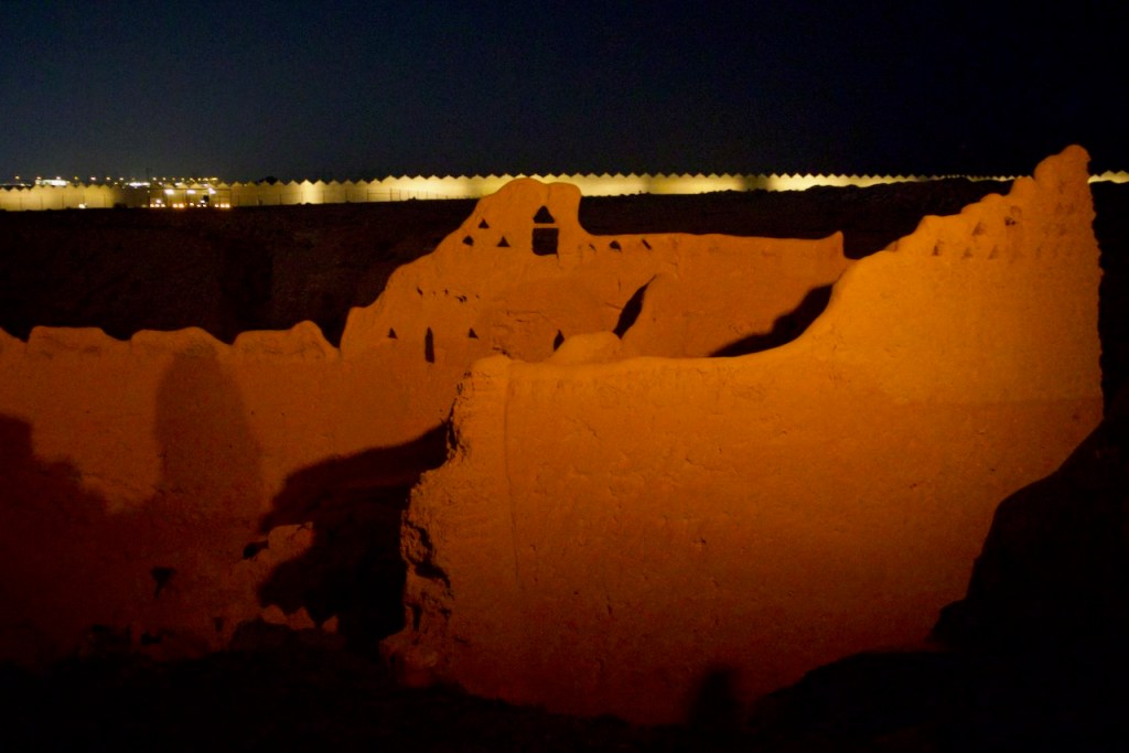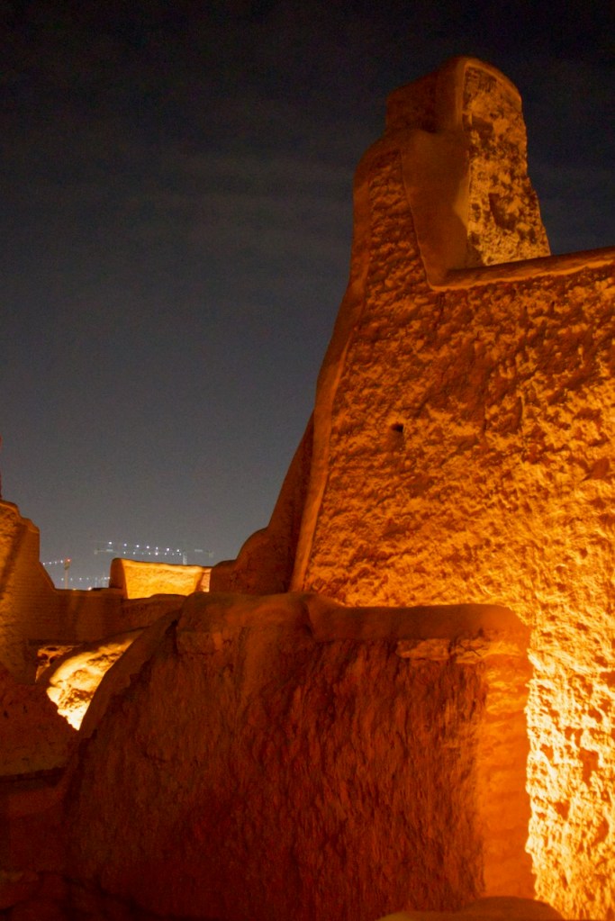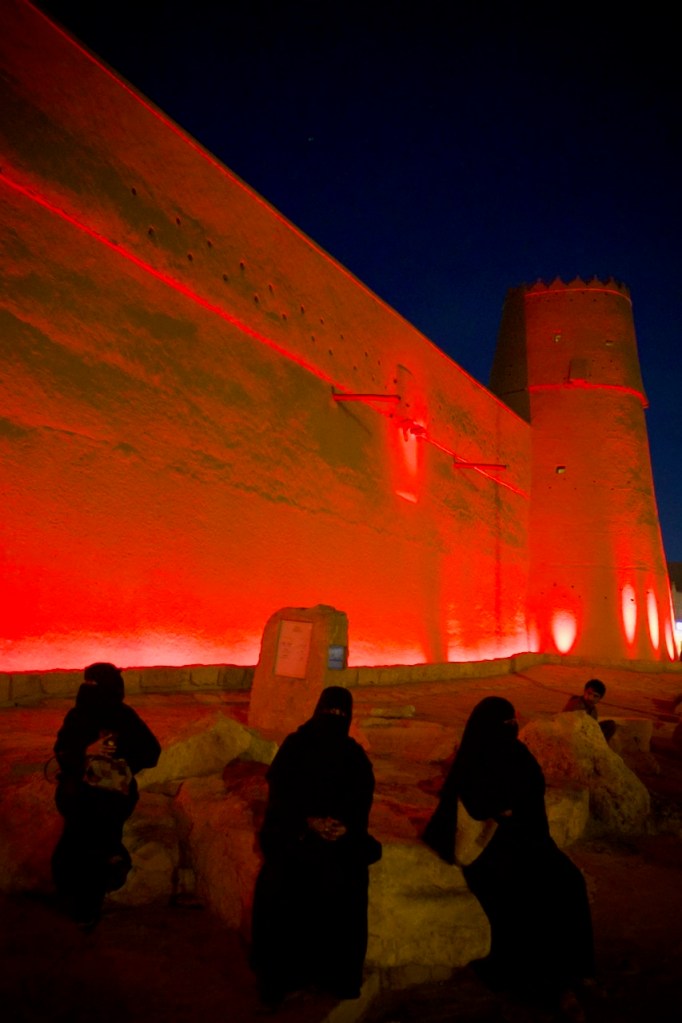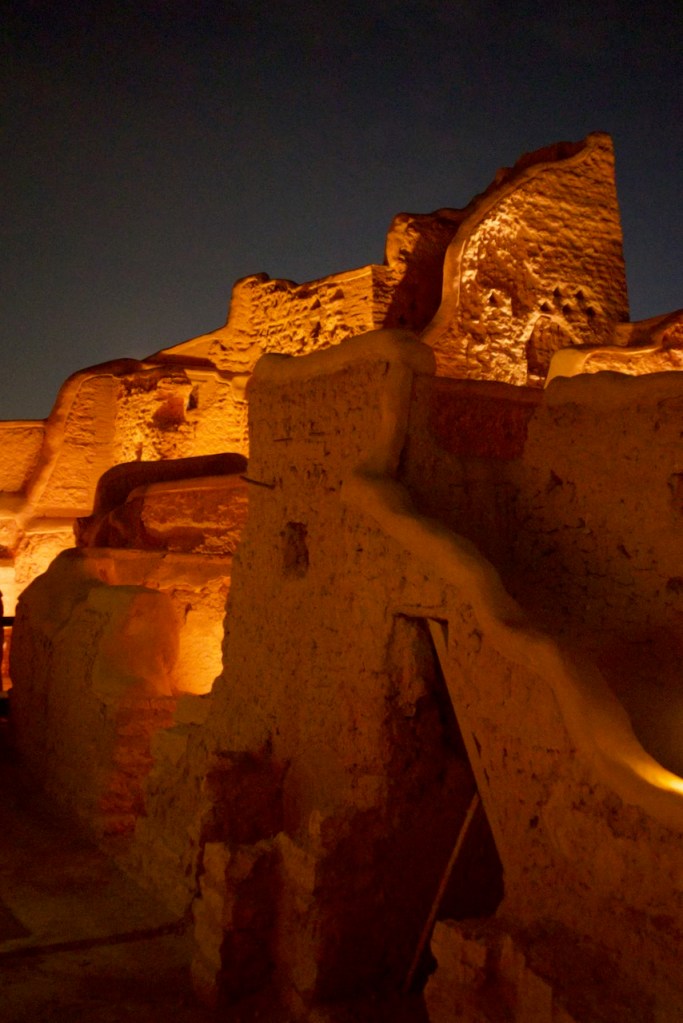 I ride the brand new subway, opened only months ago, from the airport to the centre of the capital city, and make a beeline to the National Museum (closed on Sundays). Go to Diriyah at sunset time, the locals tell me. So I arrive at dusk to find the stunning ruins – the ancestral home of the royal family, the historic birthplace of Saudi Arabia, and a UNESCO World Heritage site – exquisitely lit and teeming with visitors. While the Saudi way of managing their heritage, turning ruins into glitzy marketable products, might not be to the liking of everyone (I imagine horrified archaeologists shaking their heads at the extensive interventions), I must admit Diriyah by night is an interesting photographic moment. The sight and the sound, in the shadow of a palmy oasis in this balmy December evening, with a bonus near-full moon rising, is surely an experience.