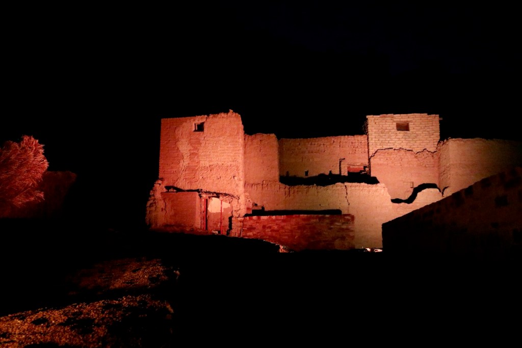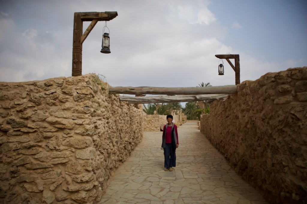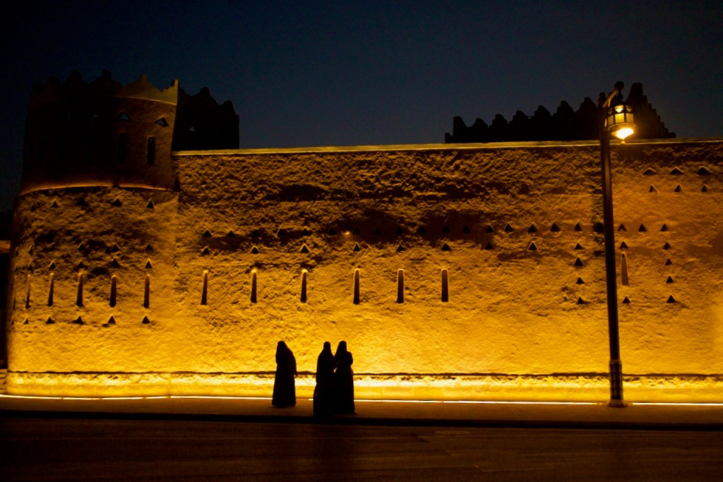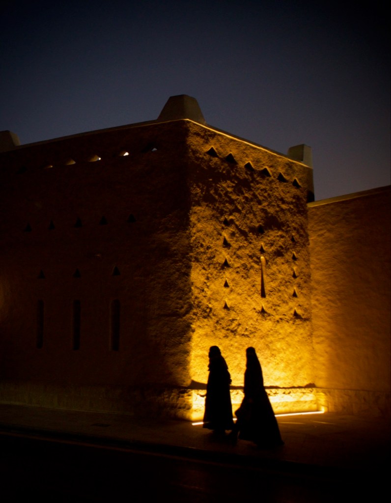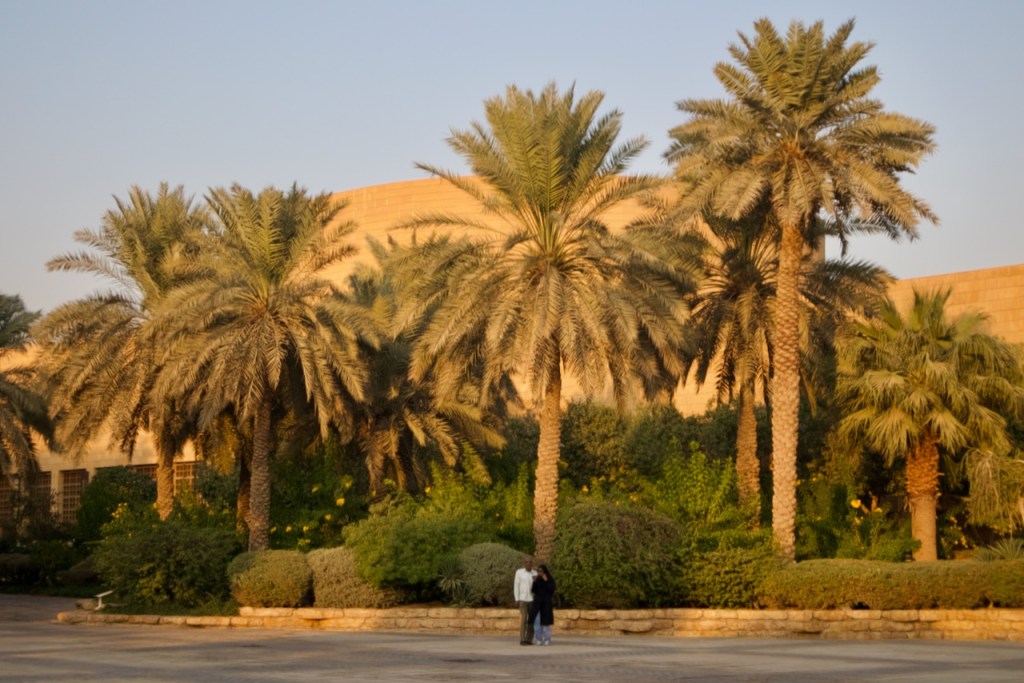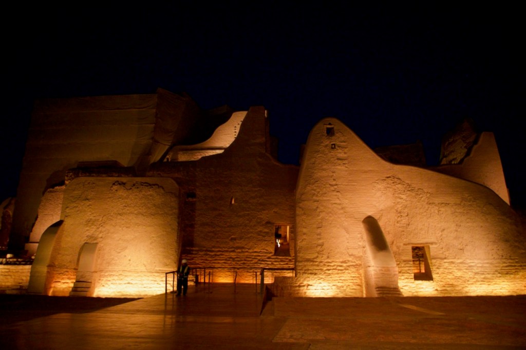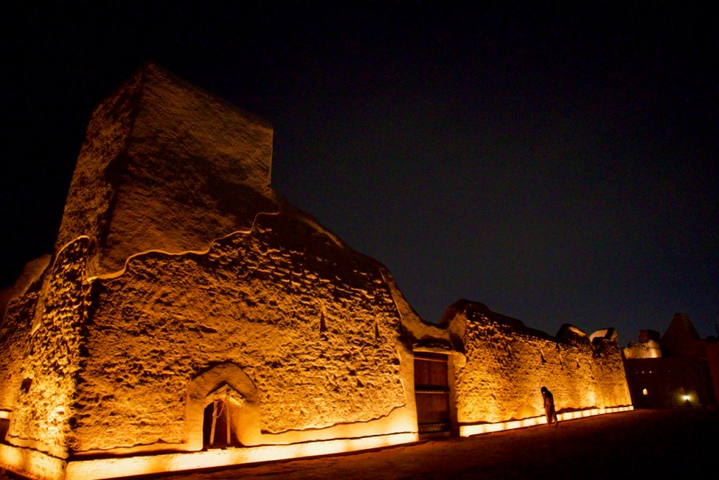 I ride the brand new subway, opened only months ago, from the airport to the centre of the capital city, and make a beeline to the National Museum (closed on Sundays). Go to Diriyah at sunset time, the locals tell me. So I arrive at dusk to find the stunning ruins – the ancestral home of the royal family, the historic birthplace of Saudi Arabia, and a UNESCO World Heritage site – exquisitely lit and teeming with visitors. While the Saudi way of managing their heritage, turning ruins into glitzy marketable products, might not be to the liking of everyone (I imagine horrified archaeologists shaking their heads at the extensive interventions), I must admit Diriyah by night is an interesting photographic moment. The sight and the sound, in the shadow of a palmy oasis in this balmy December evening, with a bonus near-full moon rising, is surely an experience.