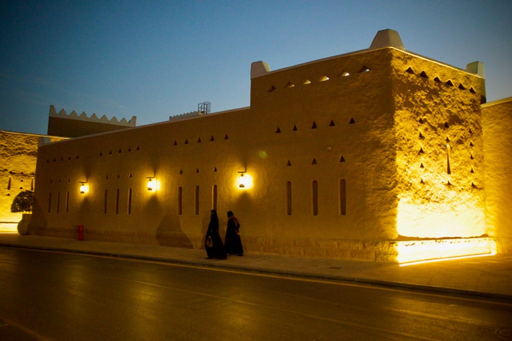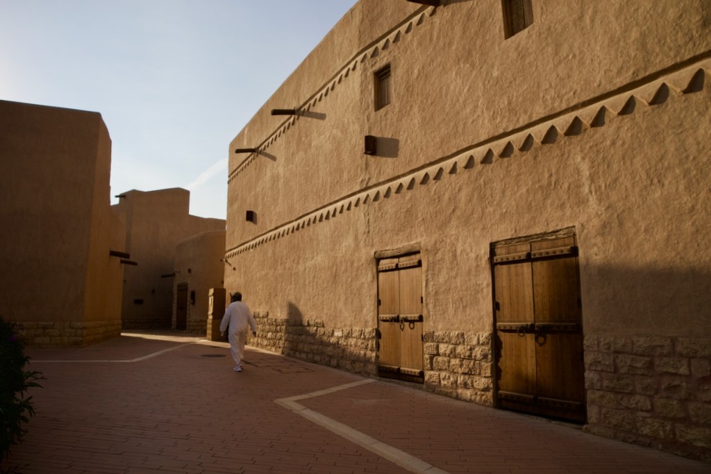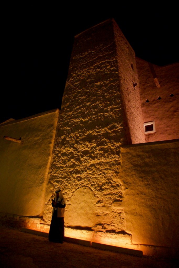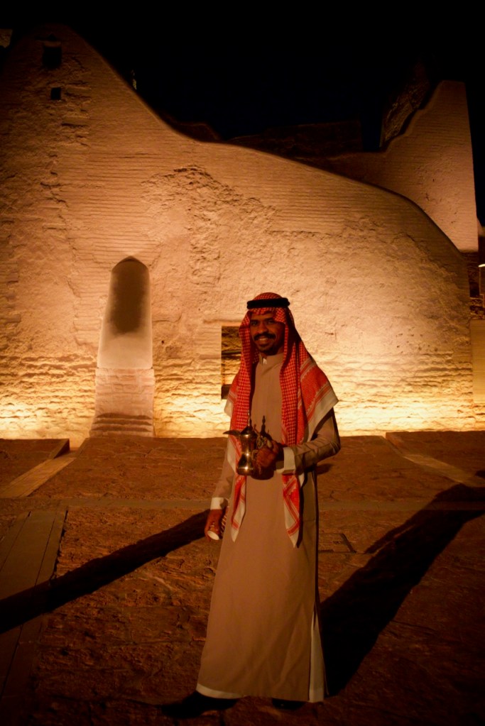 The next day I join a free cultural tour offered by the Scientist’s Gift Organization. We go through the old souk, catching the daily spectacle of an age old tradition of auction – pricey oud incense, antiques, and other valuable possessions among the traders. In this desert country with oppressive heat, everything starts in the late afternoon. We arrive at the grand Imam Turki bin Abdullah Grand Mosque and Al Masmak Fortress at dusk, once again in superb light. I trail behind the group in photographing the colourful traditional doors that make every home and palace so welcoming in an otherwise harsh desert environment. Then, there is always an abundant flow of coffee or tea and dates for nourishment, and heartening meals in great company. We wrap up our tour at the traditional Najd Village restaurant where we are offered the traditional costume – an abaya for women and a white thobe for men – and a sumptuous national dish of slow cooked chicken and rice. What a great introduction to Saudi culture!