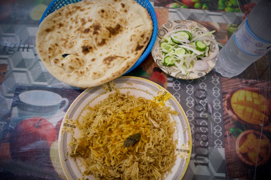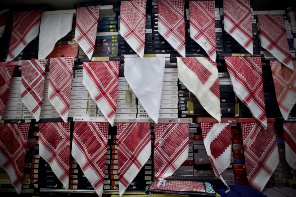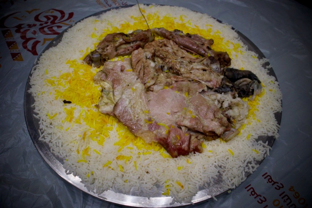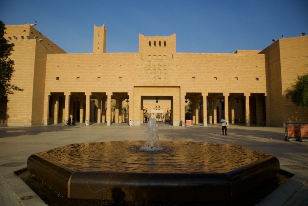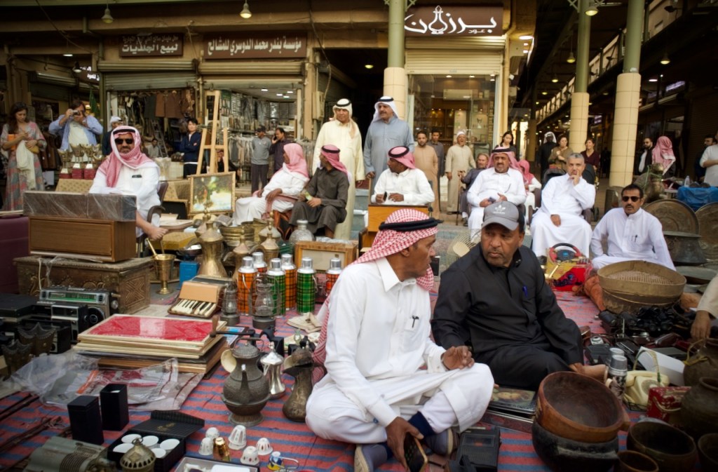The next day I join a free cultural tour offered by the Scientist’s Gift Organization. We go through the old souk, catching the daily spectacle of an age old tradition of auction – pricey oud incense, antiques, and other valuable possessions among the traders. In this desert country with oppressive heat, everything starts in the late afternoon. We arrive at the grand Imam Turki bin Abdullah Grand Mosque and Al Masmak Fortress at dusk, once again in superb light. I trail behind the group in photographing the colourful traditional doors that make every home and palace so welcoming in an otherwise harsh desert environment. Then, there is always an abundant flow of coffee or tea and dates for nourishment, and heartening meals in great company. We wrap up our tour at the traditional Najd Village restaurant where we are offered the traditional costume – an abaya for women and a white thobe for men – and a sumptuous national dish of slow cooked chicken and rice. What a great introduction to Saudi culture!