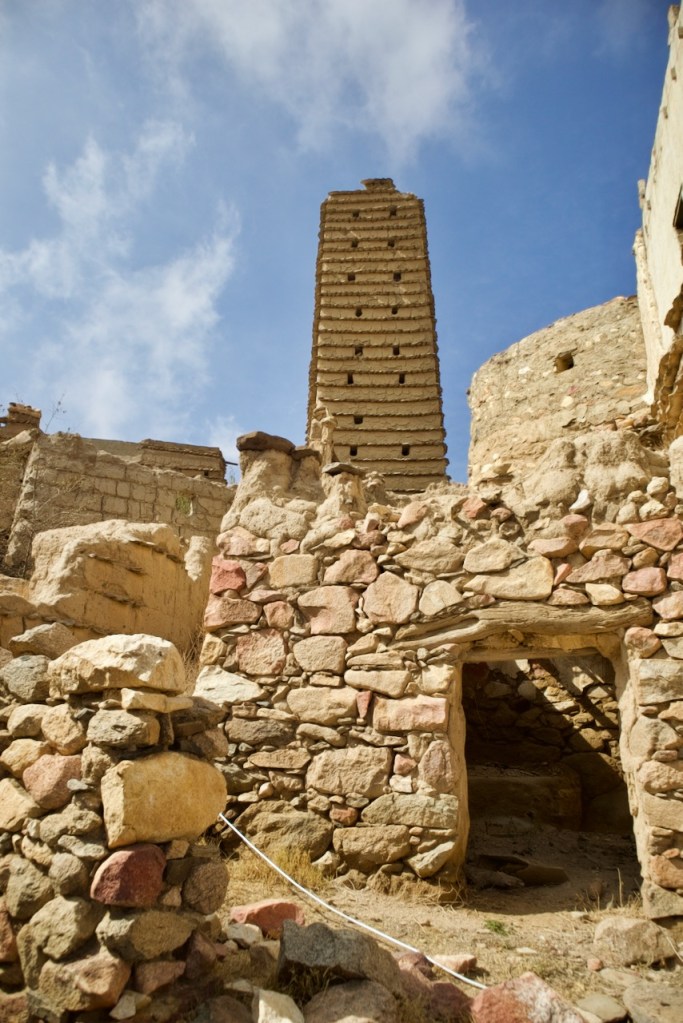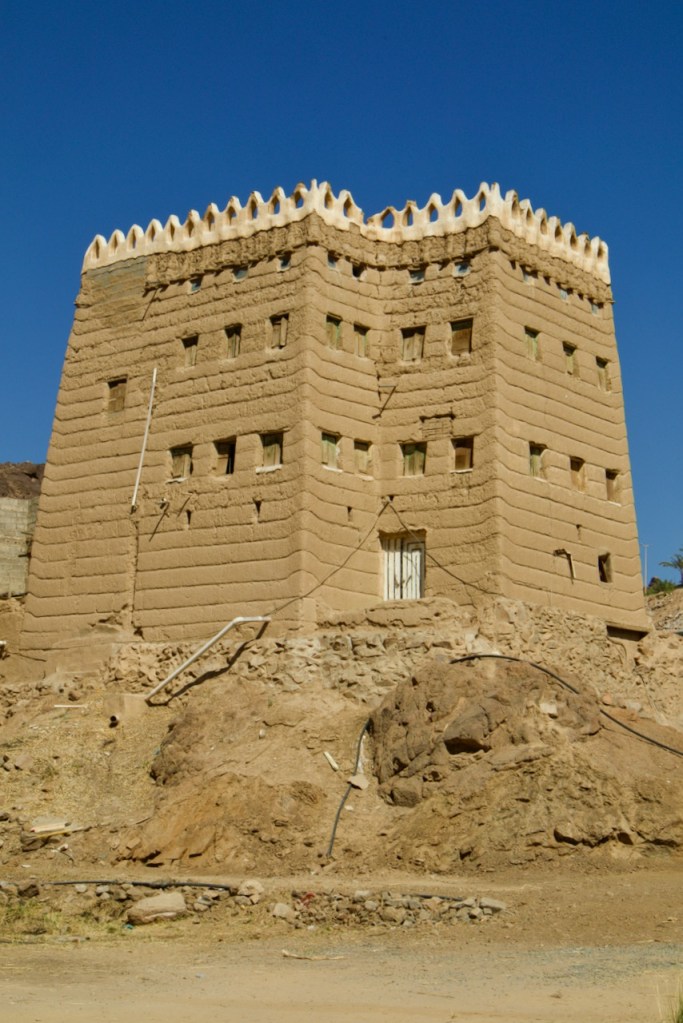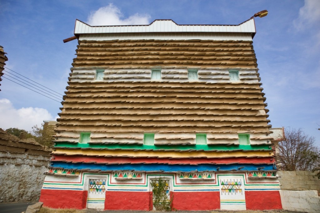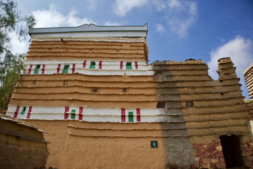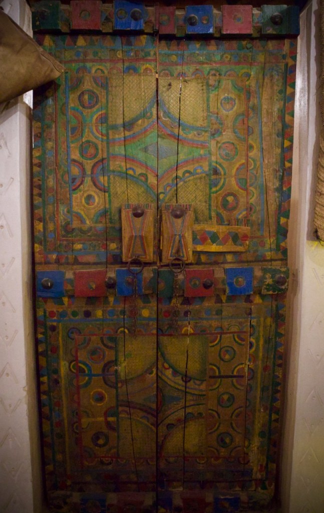 The following morning, Hassan takes me in another direction to visit the famous “hanging” village, Habala, set in the steep mountains of Asir and covered in thick fog. Alas, the cable car is closed in the winter season, but one can catch a glimpse of the precipitous drop and the dramatic setting. We make one last stop in search of Al Khalaf, a little known abandoned village marked by Yemeni townhouse-style mud brick architecture as well as bright doors and facades painted by women with Al-Asiri designs. What a gem!