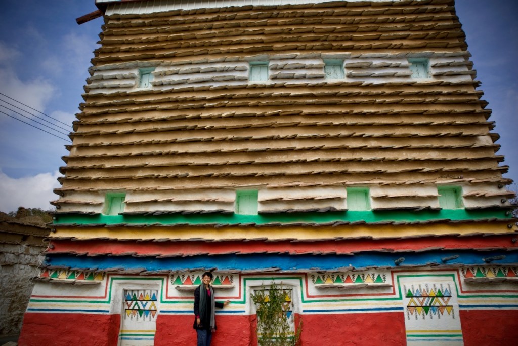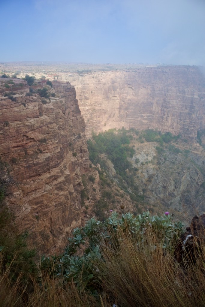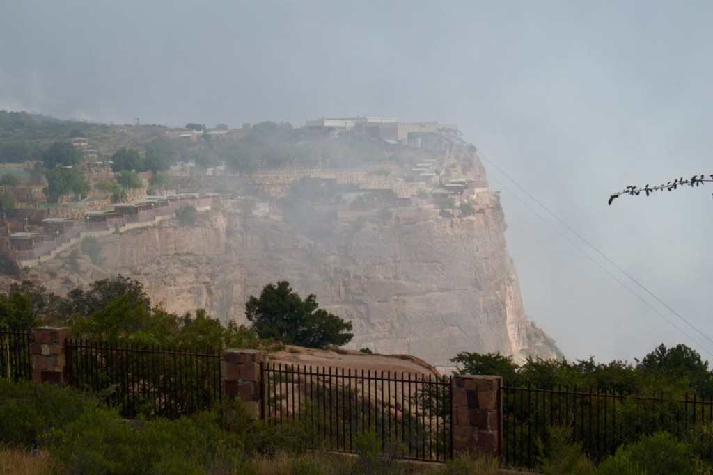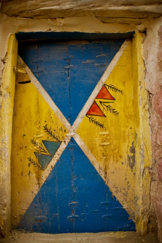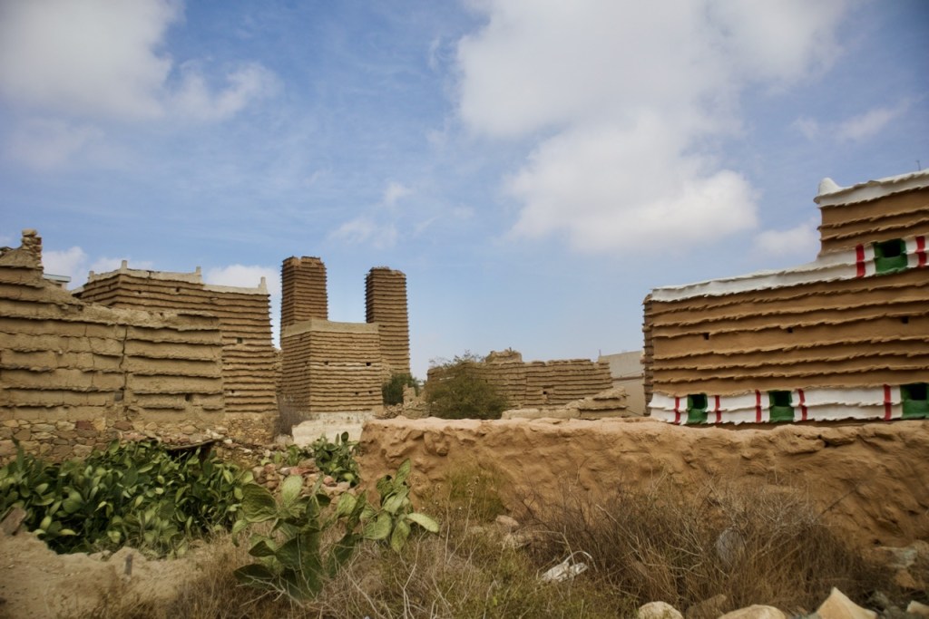 The following morning, Hassan takes me in another direction to visit the famous “hanging” village, Habala, set in the steep mountains of Asir and covered in thick fog. Alas, the cable car is closed in the winter season, but one can catch a glimpse of the precipitous drop and the dramatic setting. We make one last stop in search of Al Khalaf, a little known abandoned village marked by Yemeni townhouse-style mud brick architecture as well as bright doors and facades painted by women with Al-Asiri designs. What a gem!